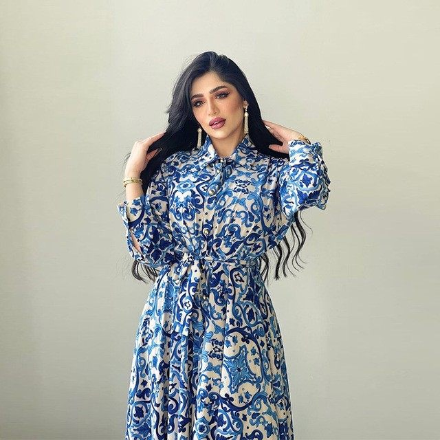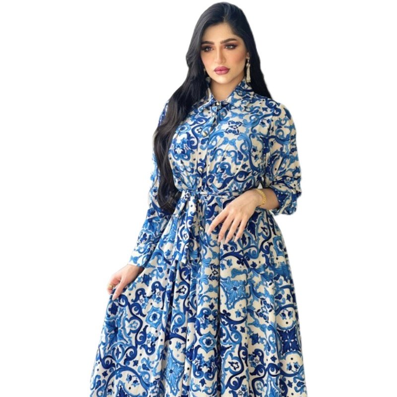 📚 New Muslim Women's Lapel Printed Long Sleeve Dress with Belt