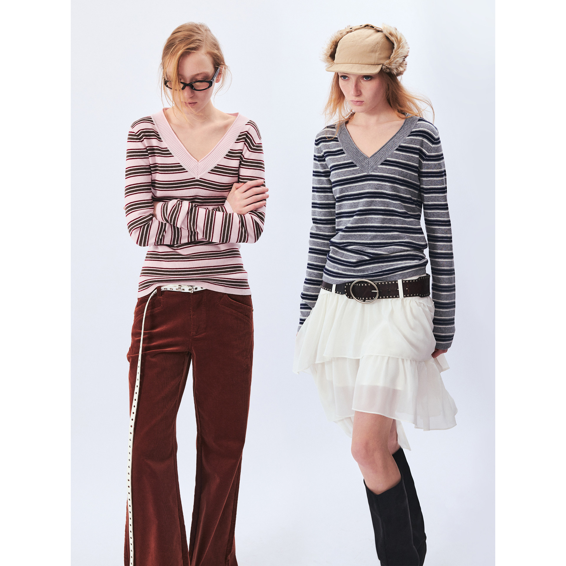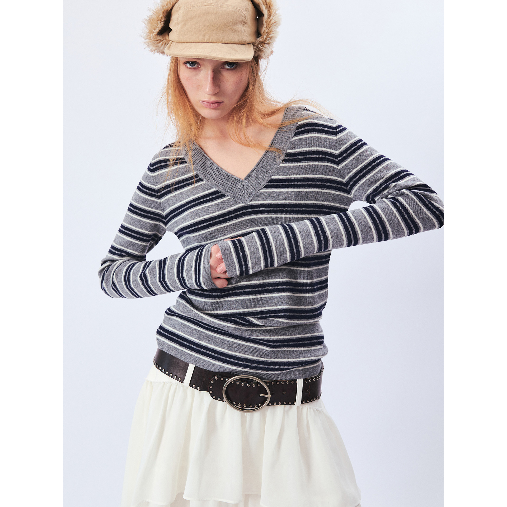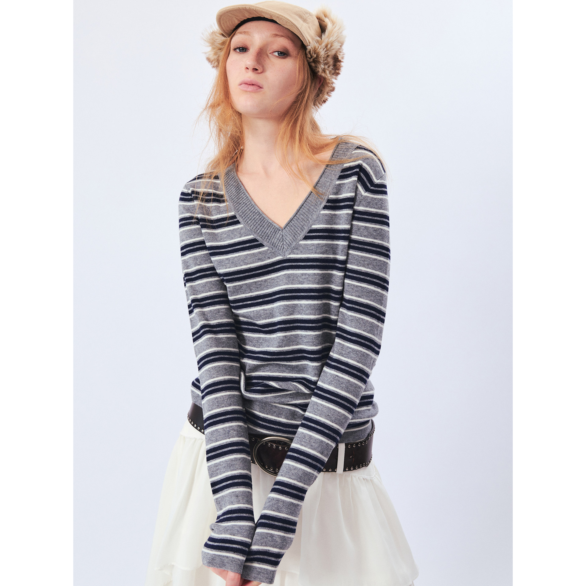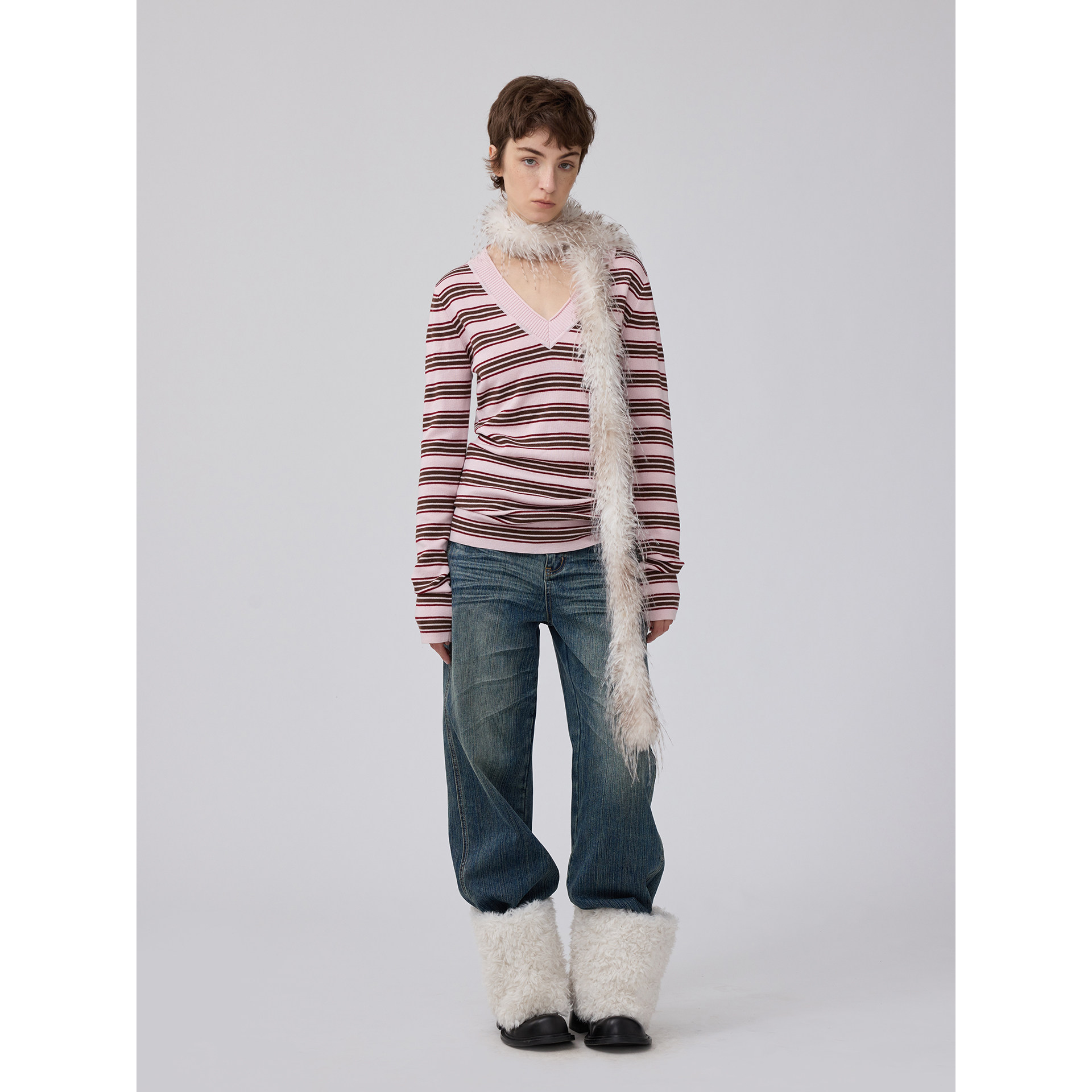 📚 1C00M4羊毛卷边V领细闪条纹T针织衫毛织上衣新年战袍春季毛衣