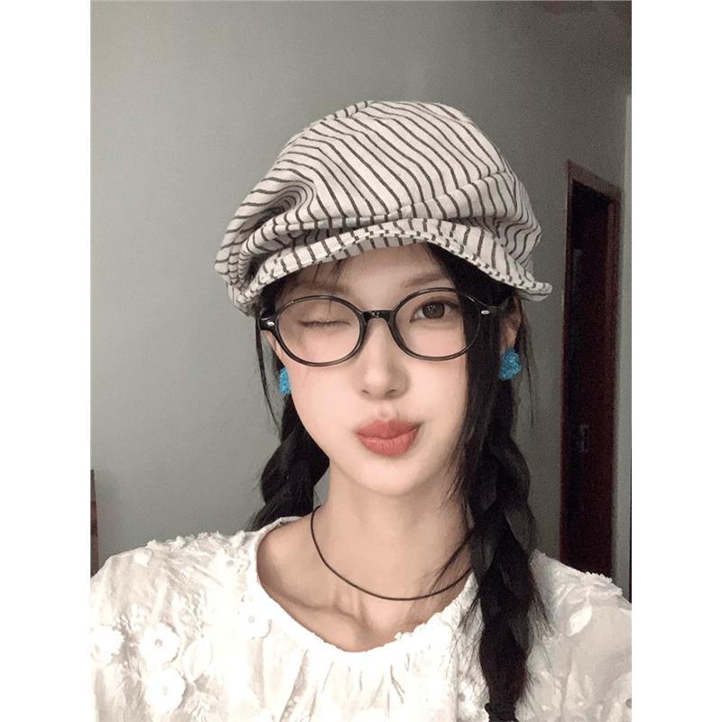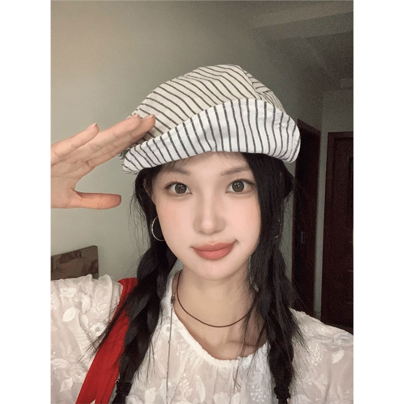 📚 日系文艺复古条纹八角帽子女夏季棉麻透气贝雷帽百搭显脸小报童帽