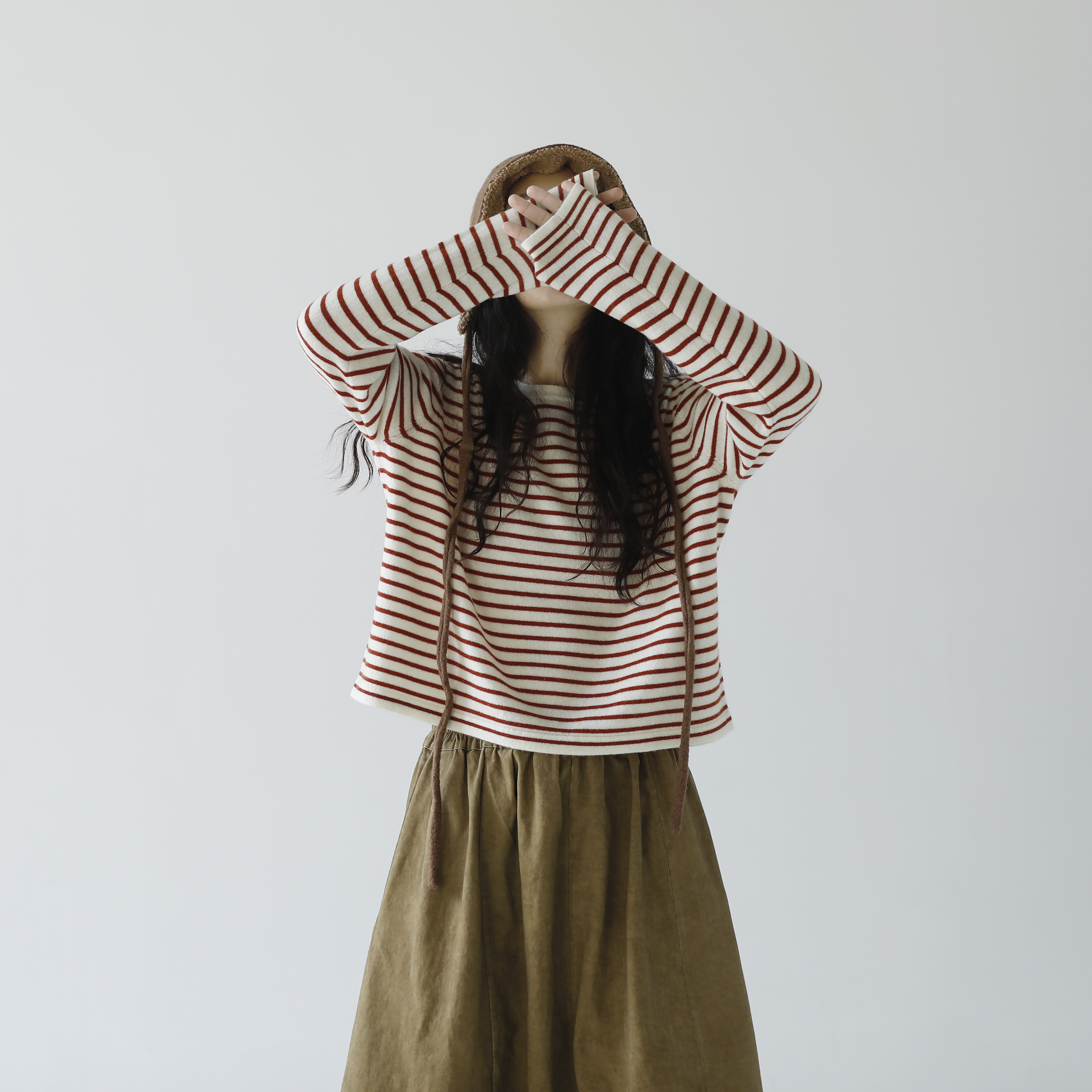 📚 复述羊毛红白条纹圆领短款长袖上衣女早秋休闲百搭慵懒打底衫