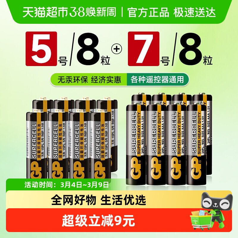 📚 GP超霸碳性电池16粒干电池5号8粒+7号8粒空调遥控器儿童玩具电池