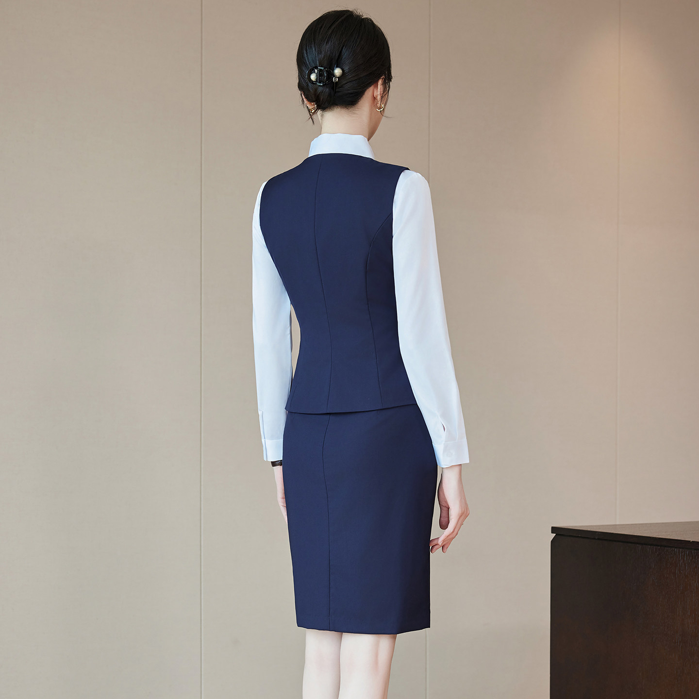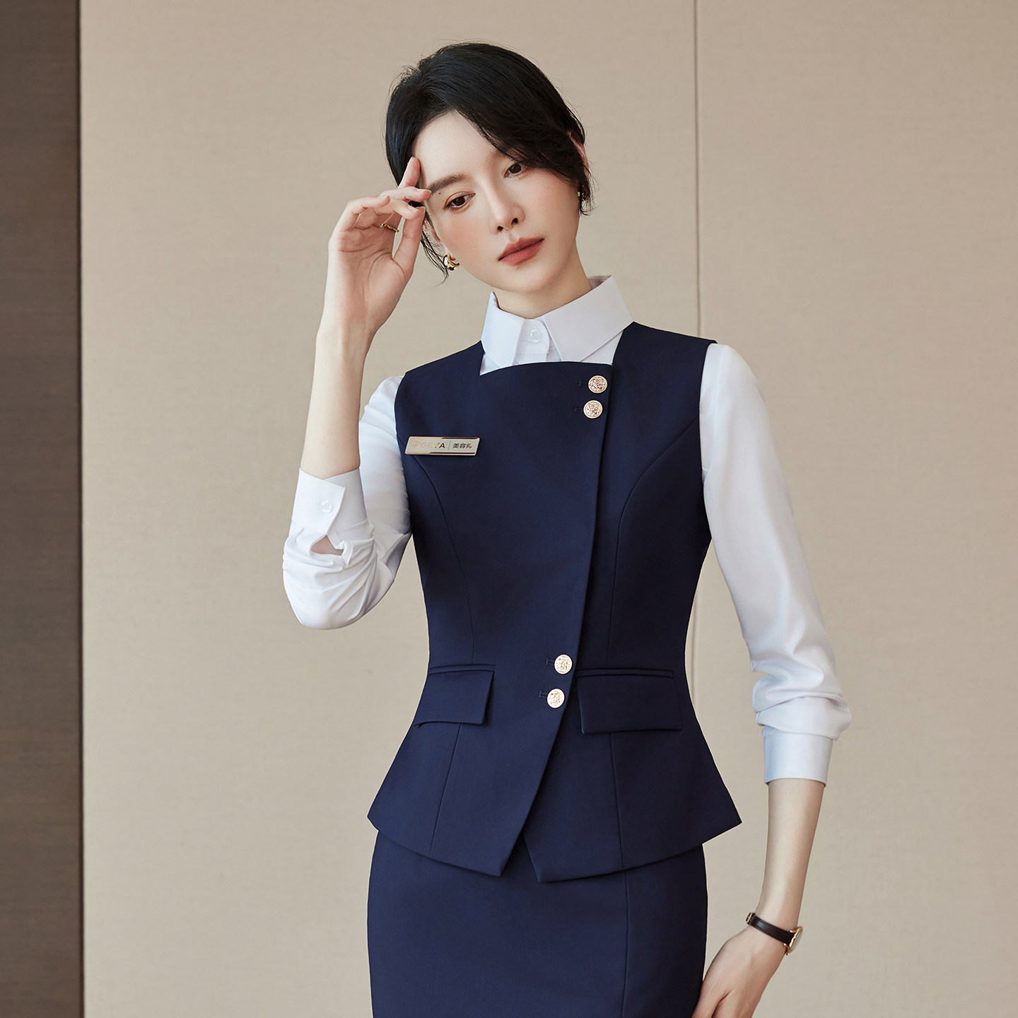 📚 气质灰色藏青马甲套裙酒店工作服女设计感时尚珠宝店前台工装制服