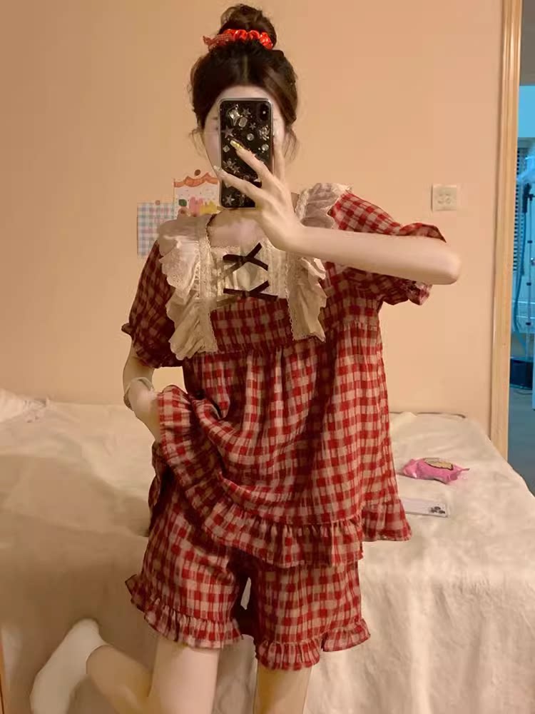 📚 棉麻睡衣女夏季新款格子甜美蕾丝公主风蝴蝶结短袖宽松家居服套装