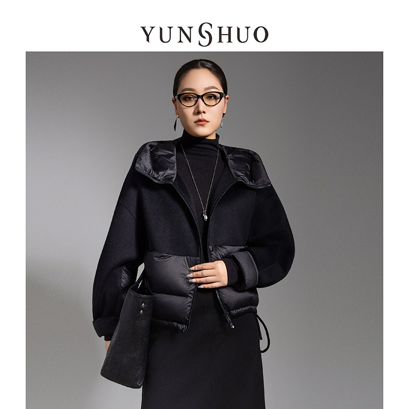 📚 允硕新品短款连帽羽绒服拼接黑色宽松长袖大衣女上衣外套495026