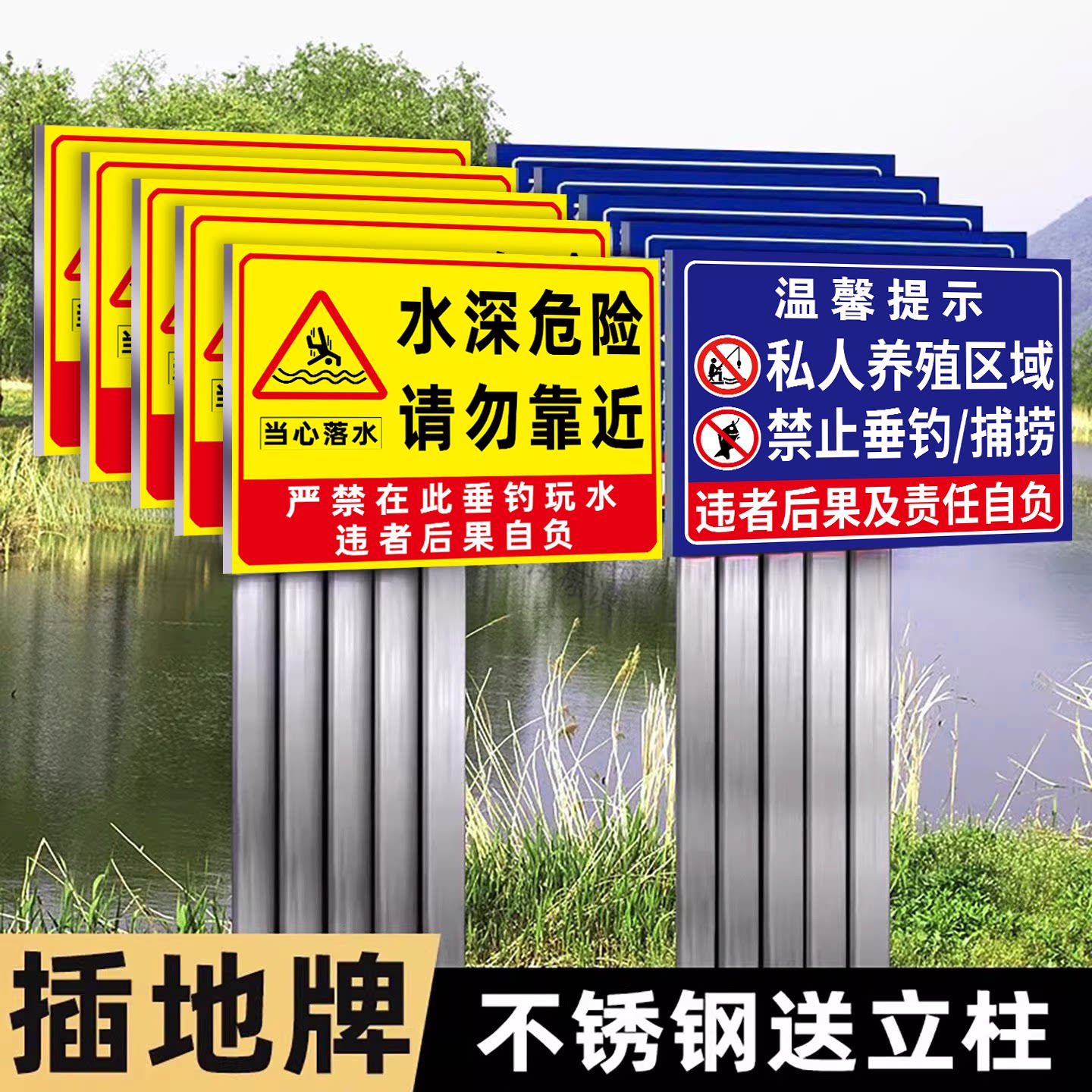 📚 水深危险请勿靠近户外立柱防溺水标识牌私人鱼塘禁止钓鱼警示牌水库禁止游泳打闹违者后果自负警告牌标语