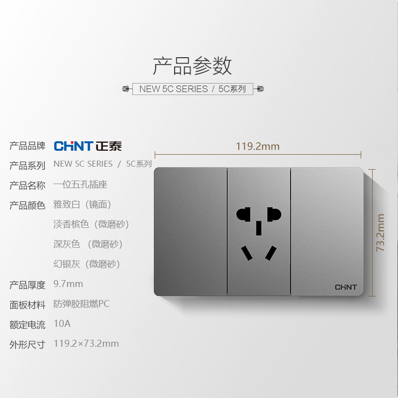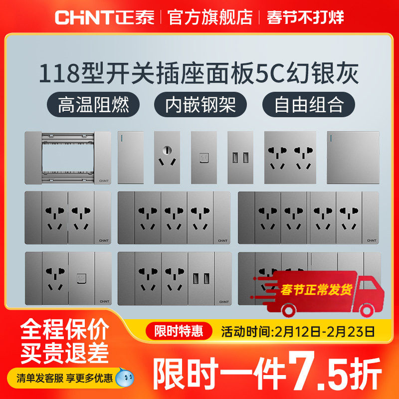 📚 正泰5C幻银灰118型开关插座模块五孔二三插16a电源带usb插孔面板