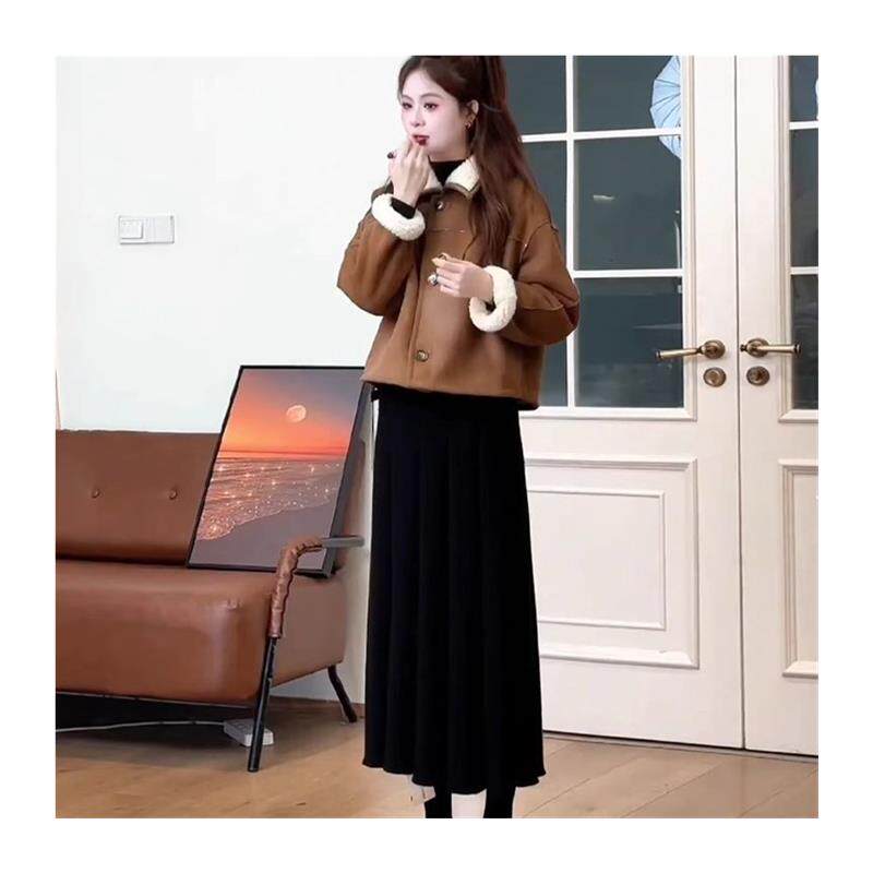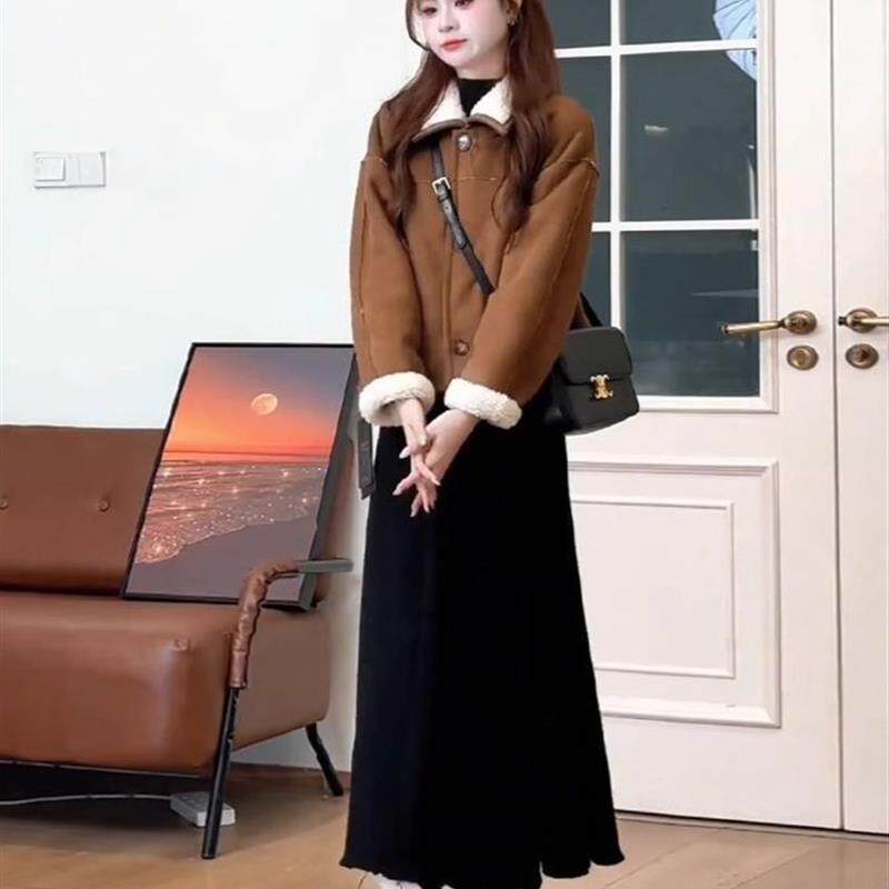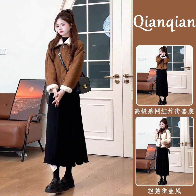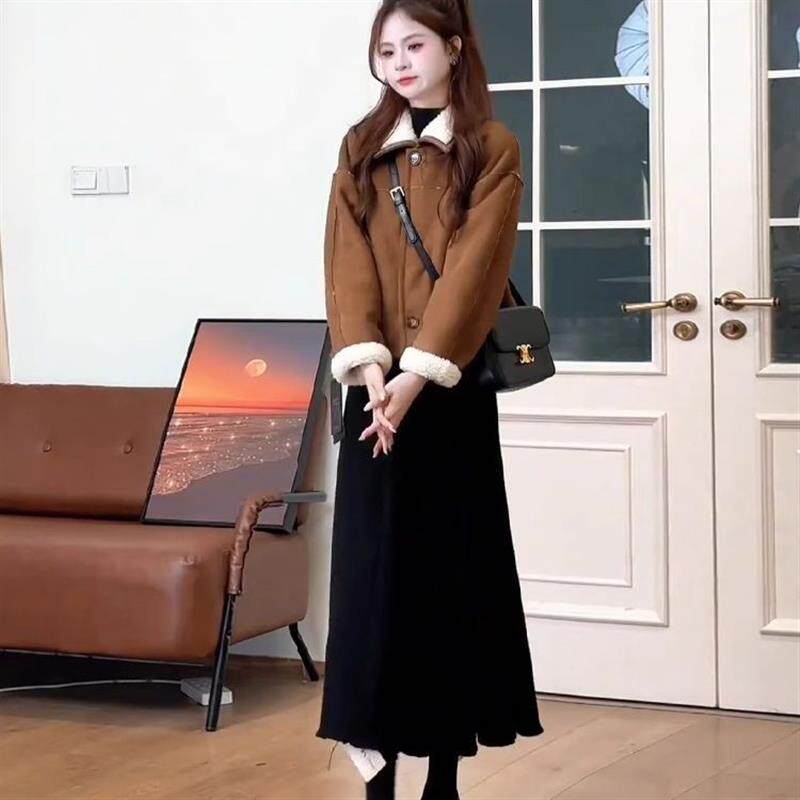 📚 冬装双面穿咖色羊羔毛短外套女韩系小香风加绒上衣半身裙两件套装