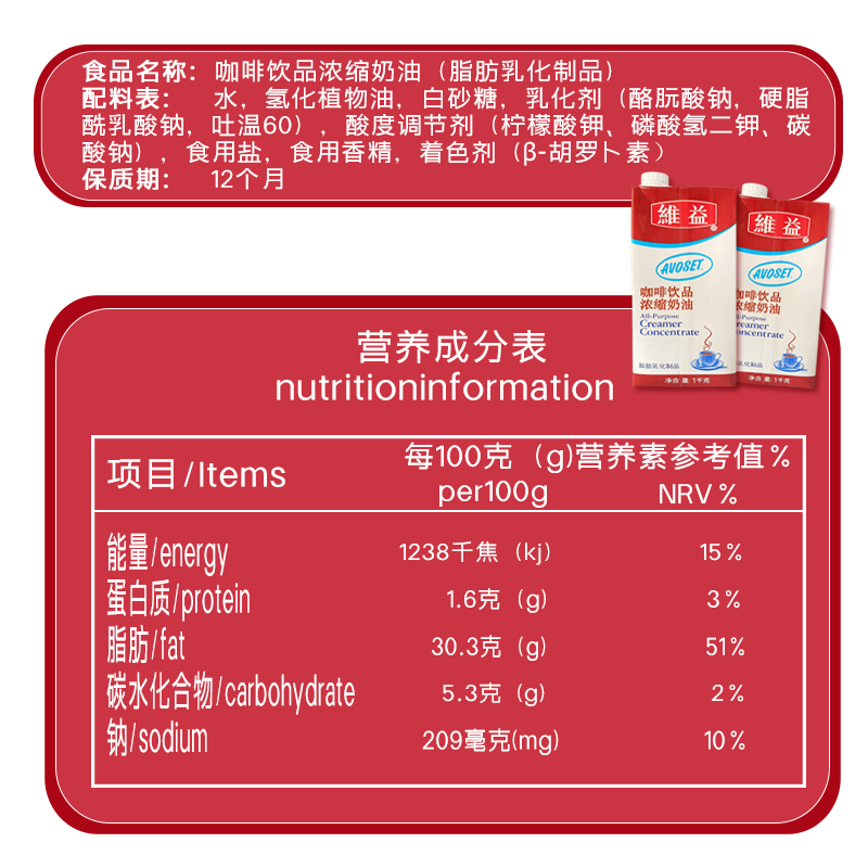 📚 维益爱护牌浓缩奶油1kg*12盒咖啡饮品咖啡厅奶茶店商用自制