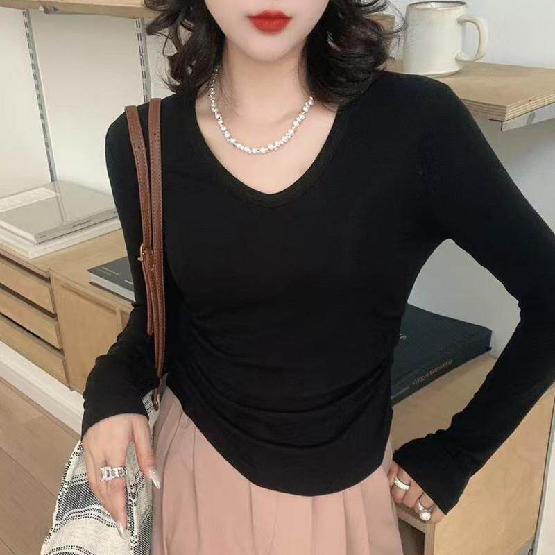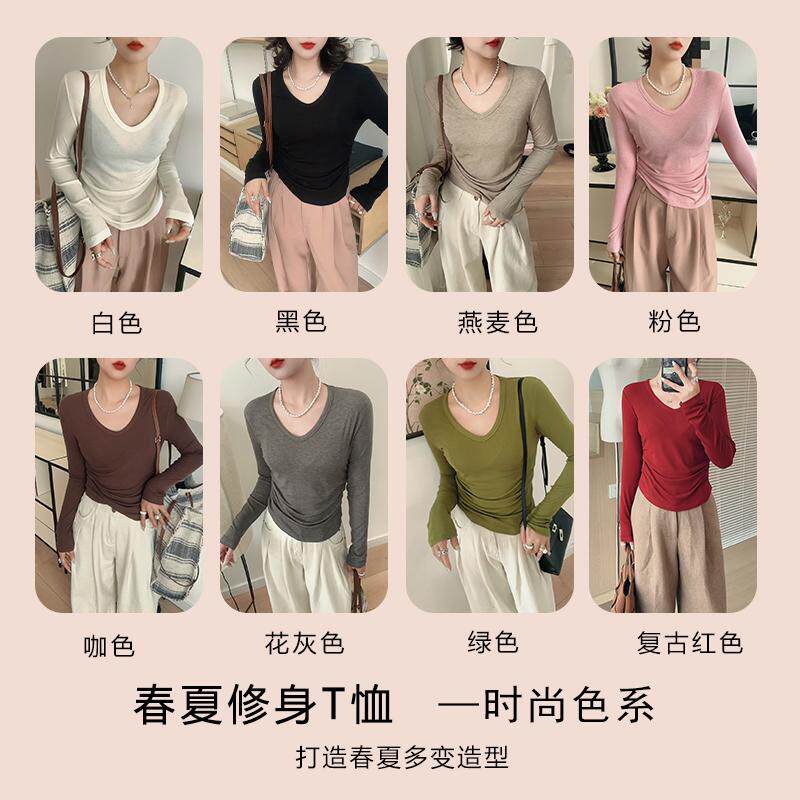 📚 天丝羊毛粉色V领2025欧货爆款t恤女初春漂亮上衣显瘦洋气打底衫薄