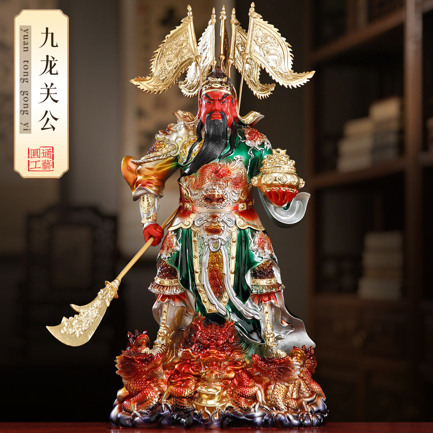📚 纯铜彩绘关公摆件聚宝盆关公神像家用办公室招财武财神九龙关二爷