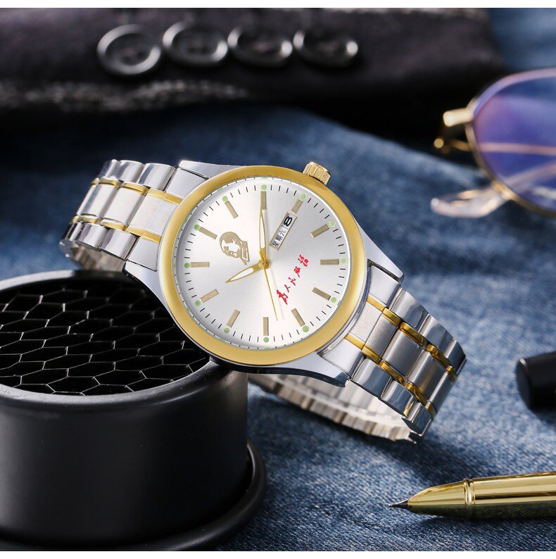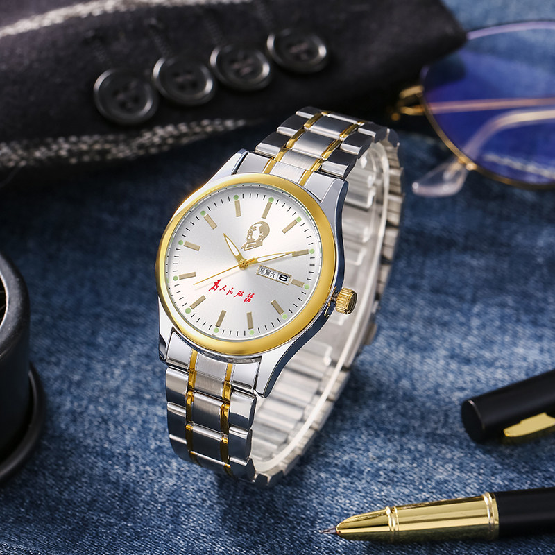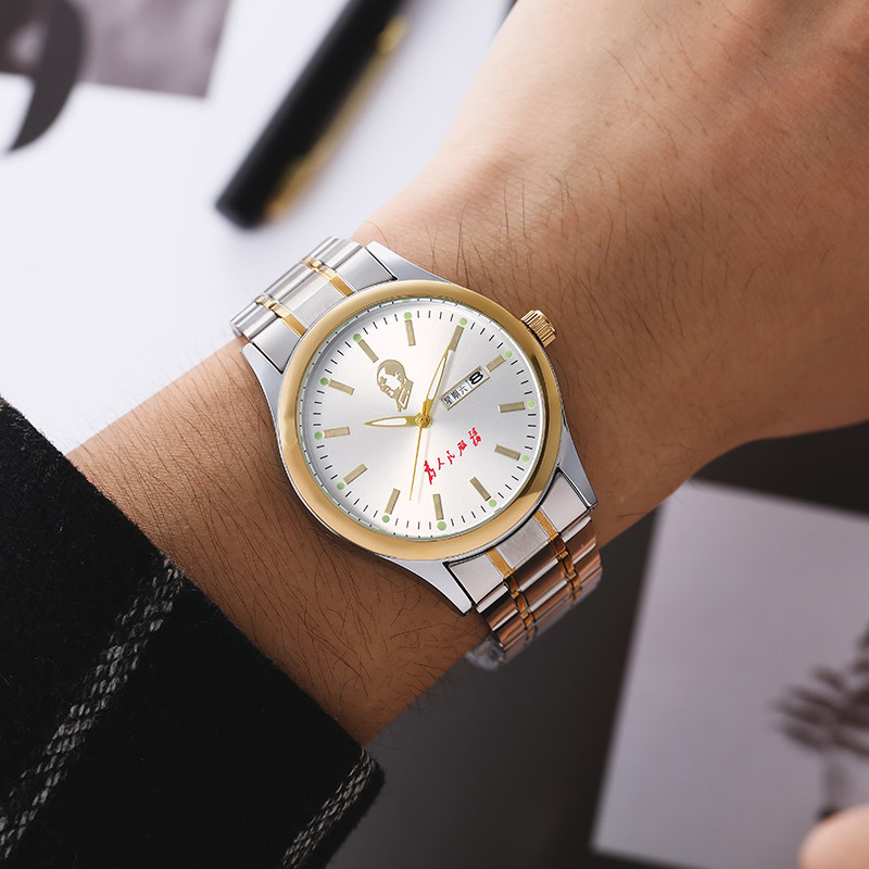 📚 老上海风格男士双日历精钢夜光防水复古为人民服务送礼中老年手表