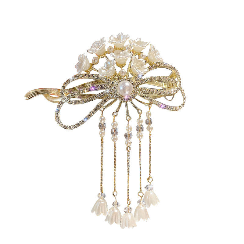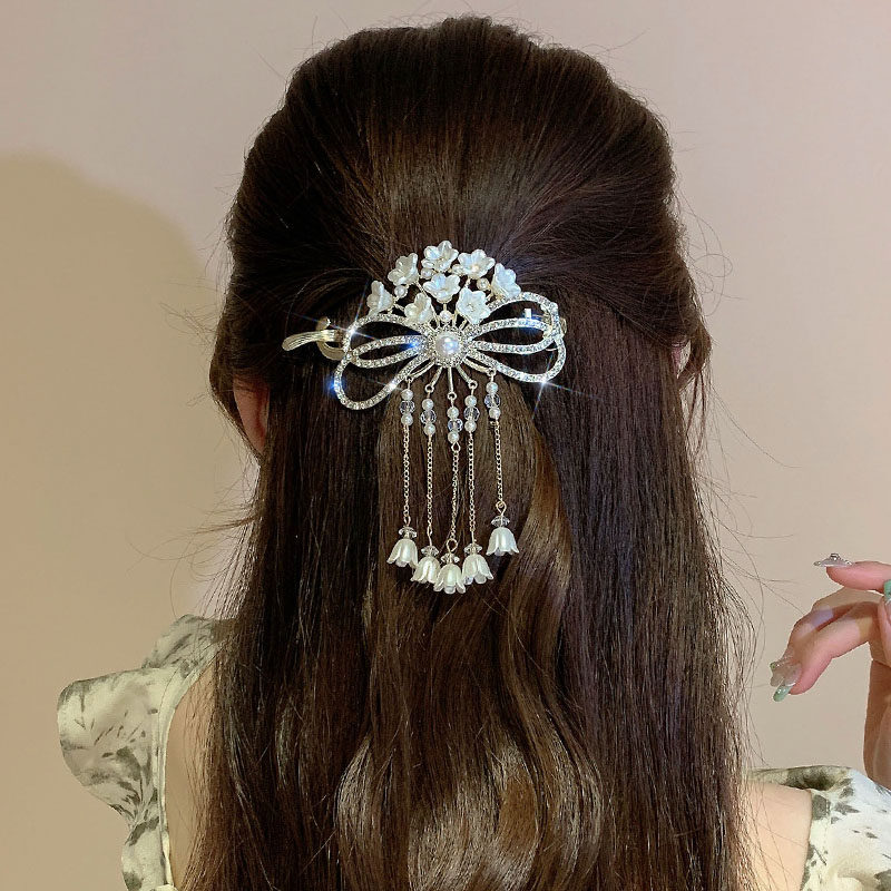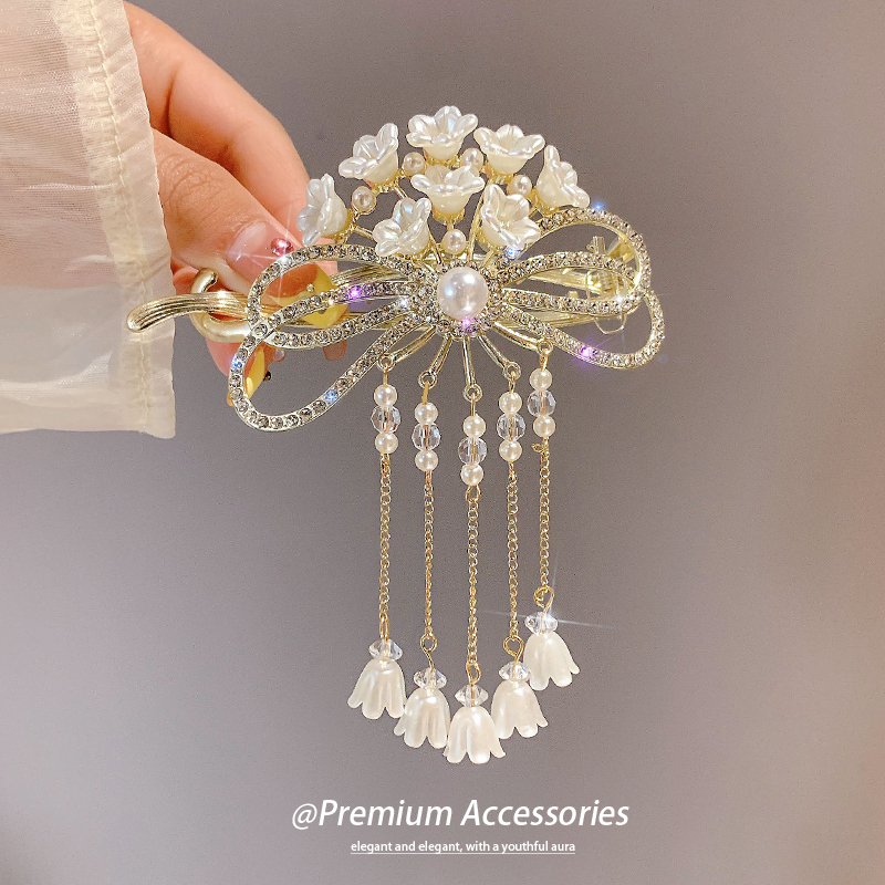 📚 轻奢珍珠铃兰花流苏发夹女青蛙扣一字夹后脑勺盘发扭扭夹发卡头饰