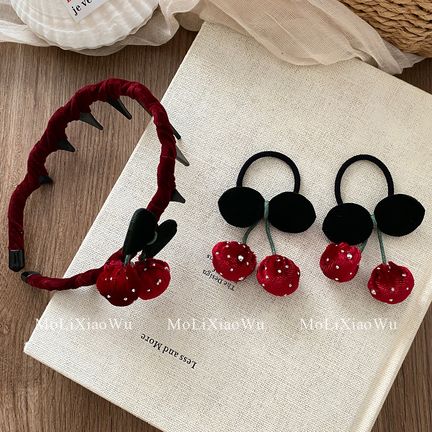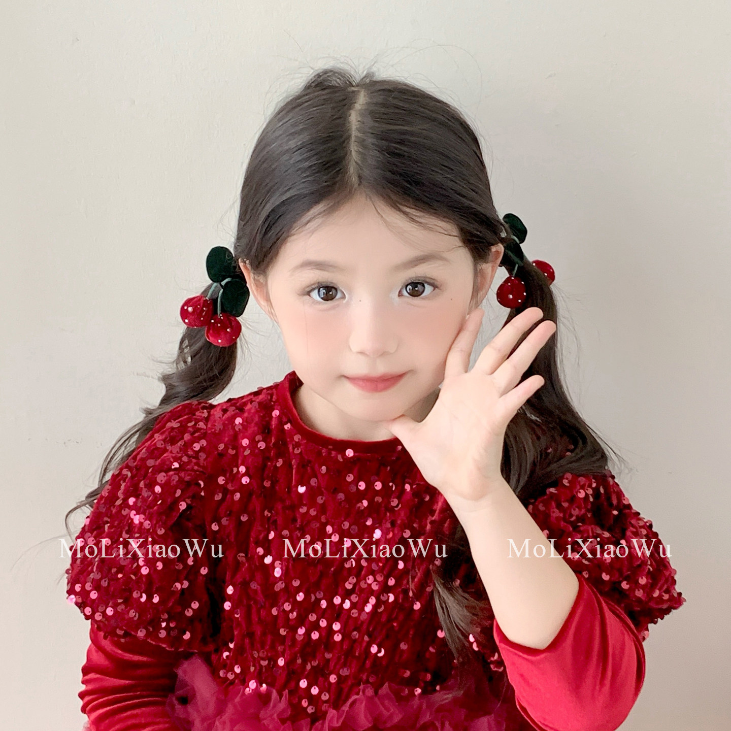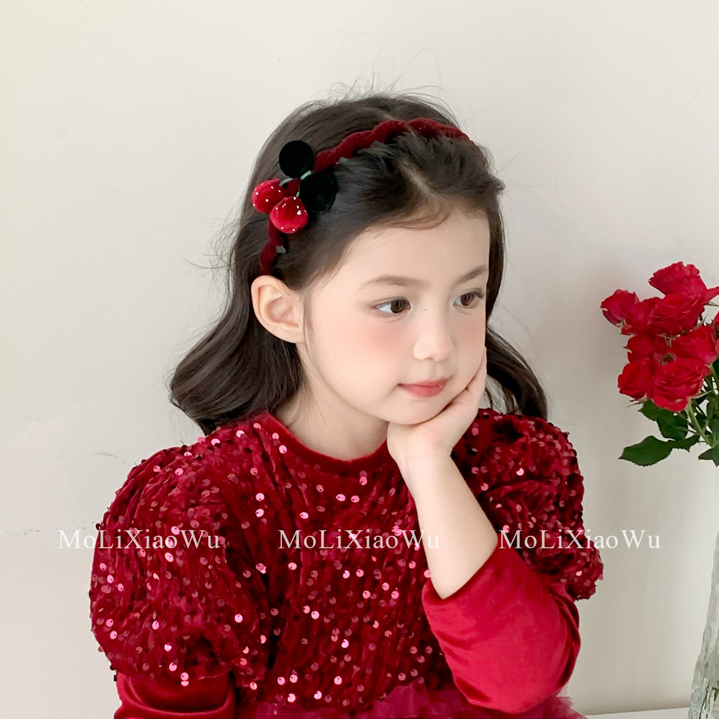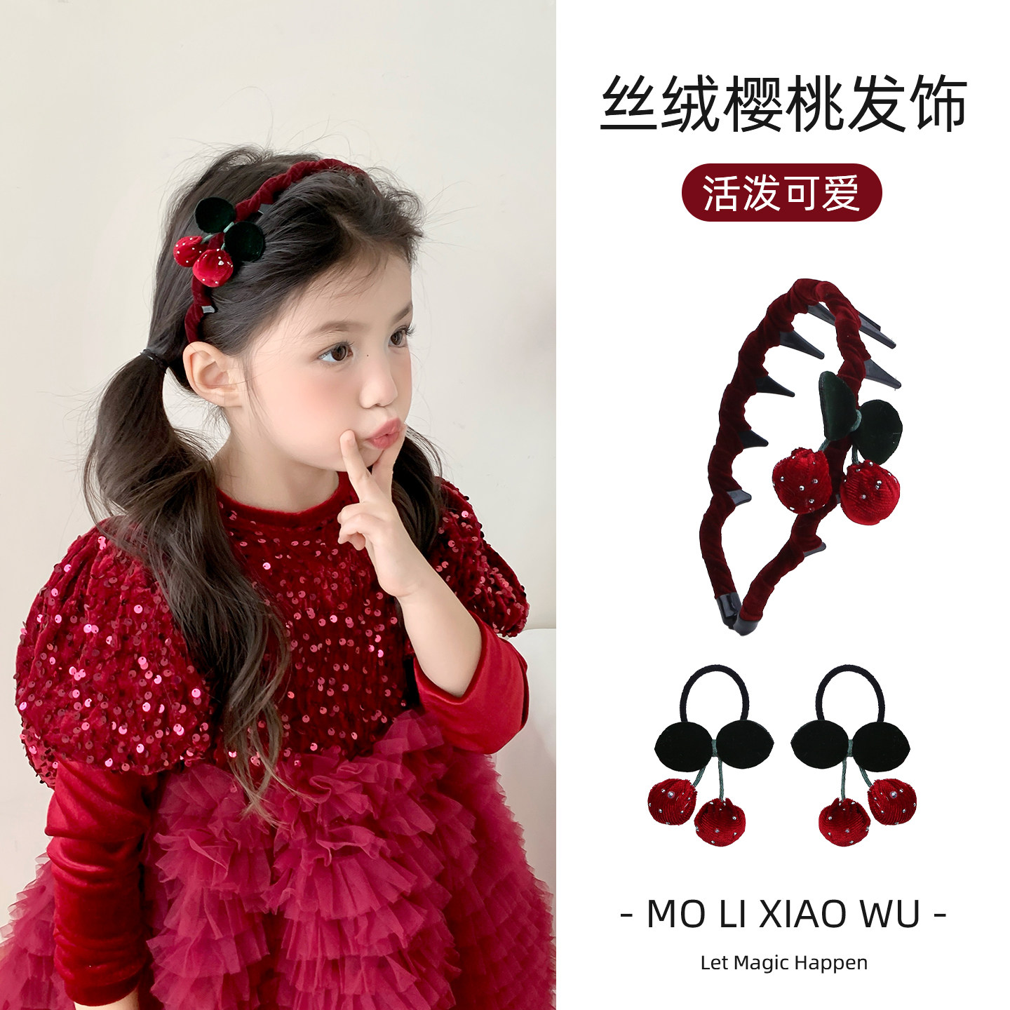 📚 新年儿童头箍红色丝绒小樱桃发饰防滑带齿不伤发头饰拜年女童发圈