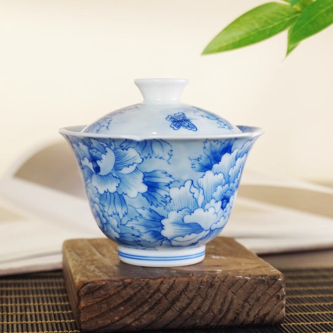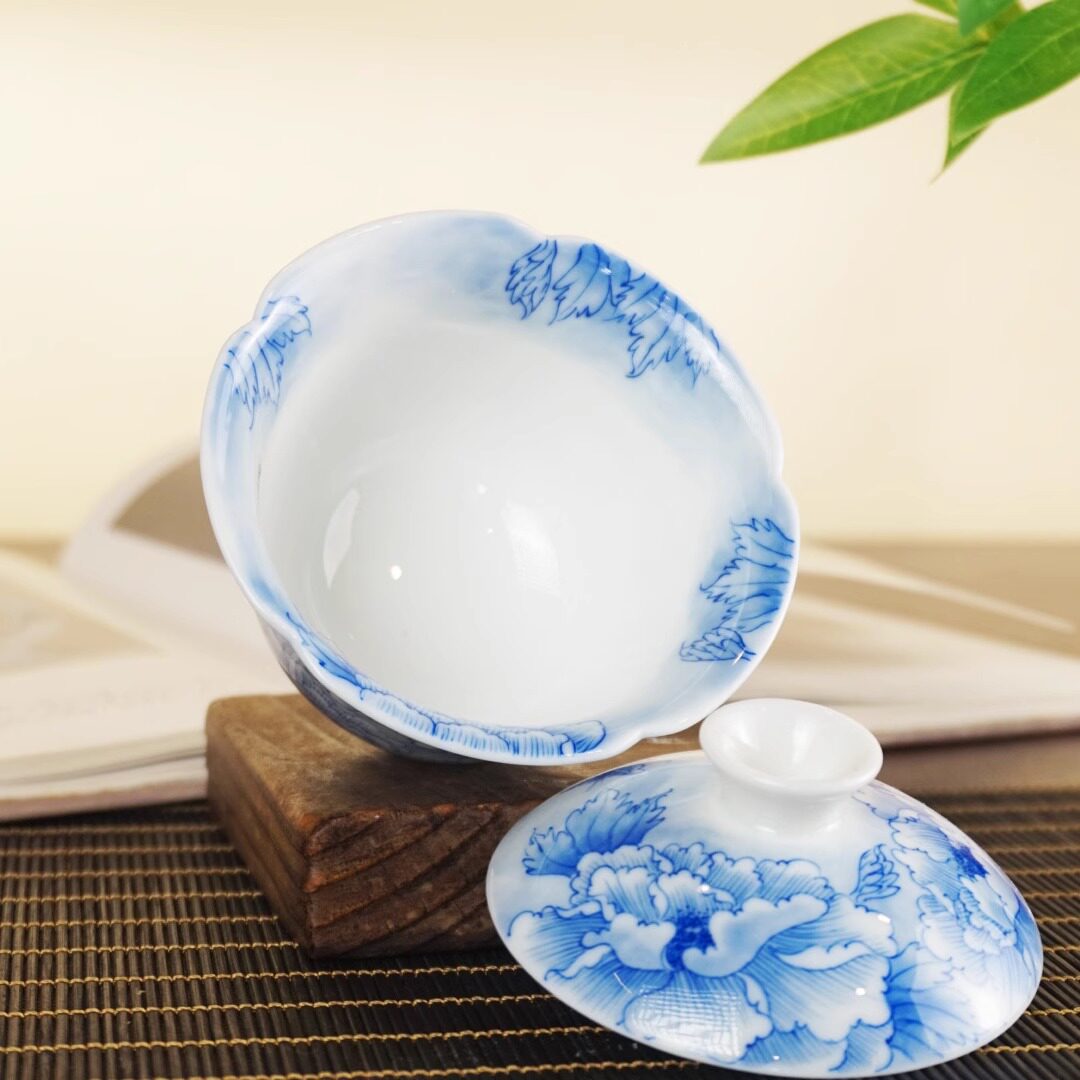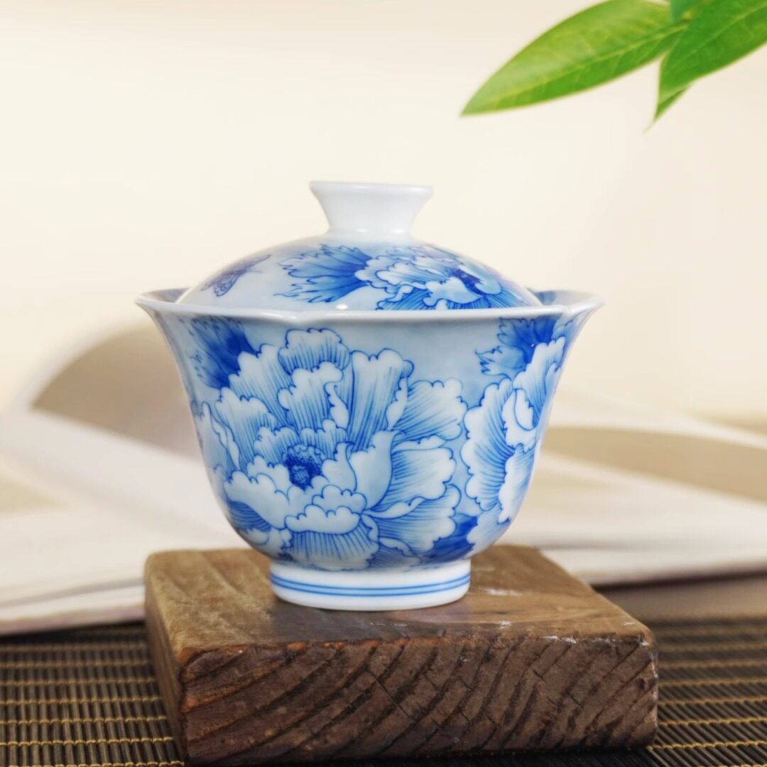 📚 素锦山房手绘青花瓷牡丹二才盖碗葵口110ml纯手工手绘釉下景德镇