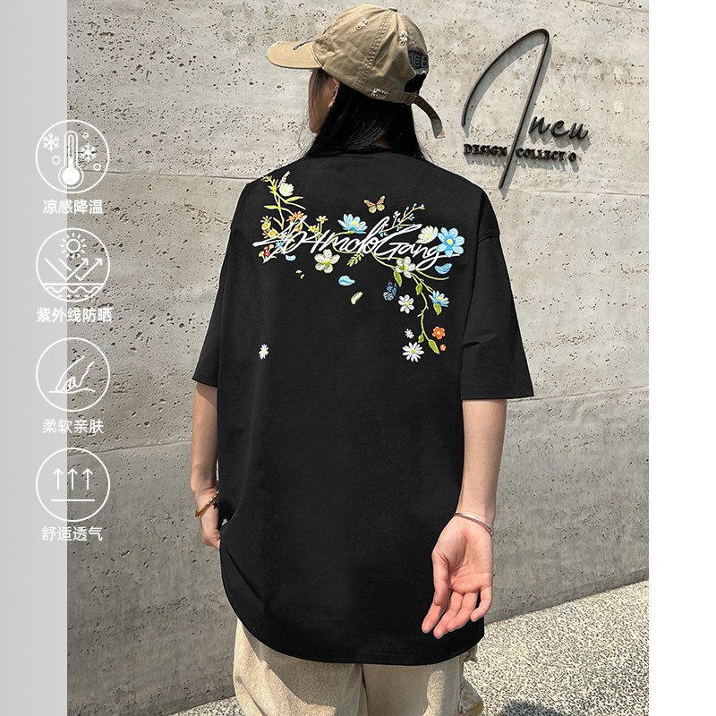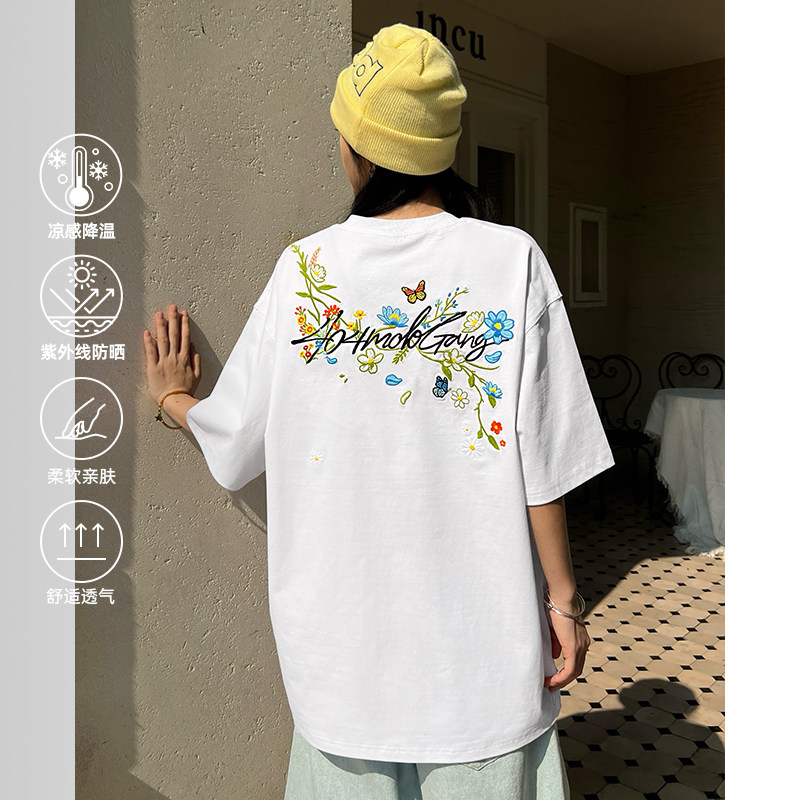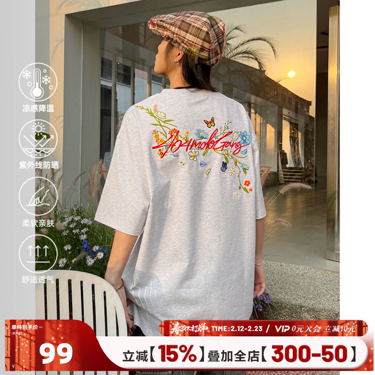 📚 [章若楠同款]404MOB手写花卉刺绣短袖T恤男女款凉感UPF50防晒t恤