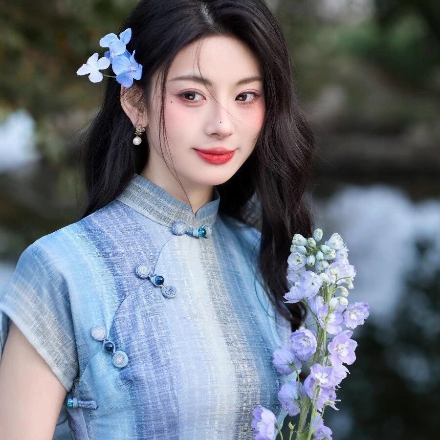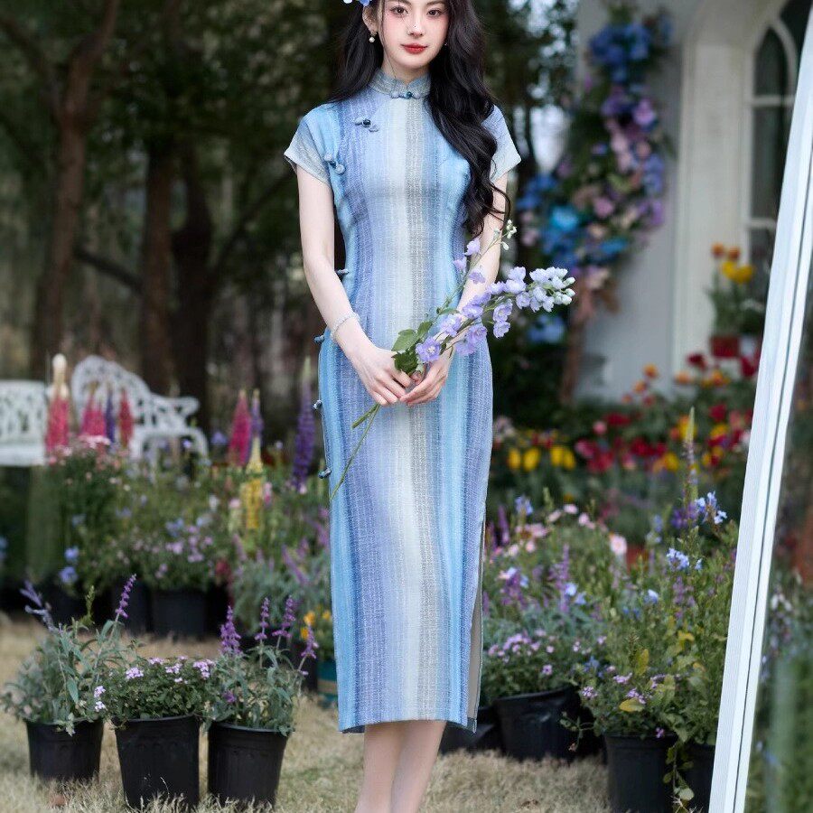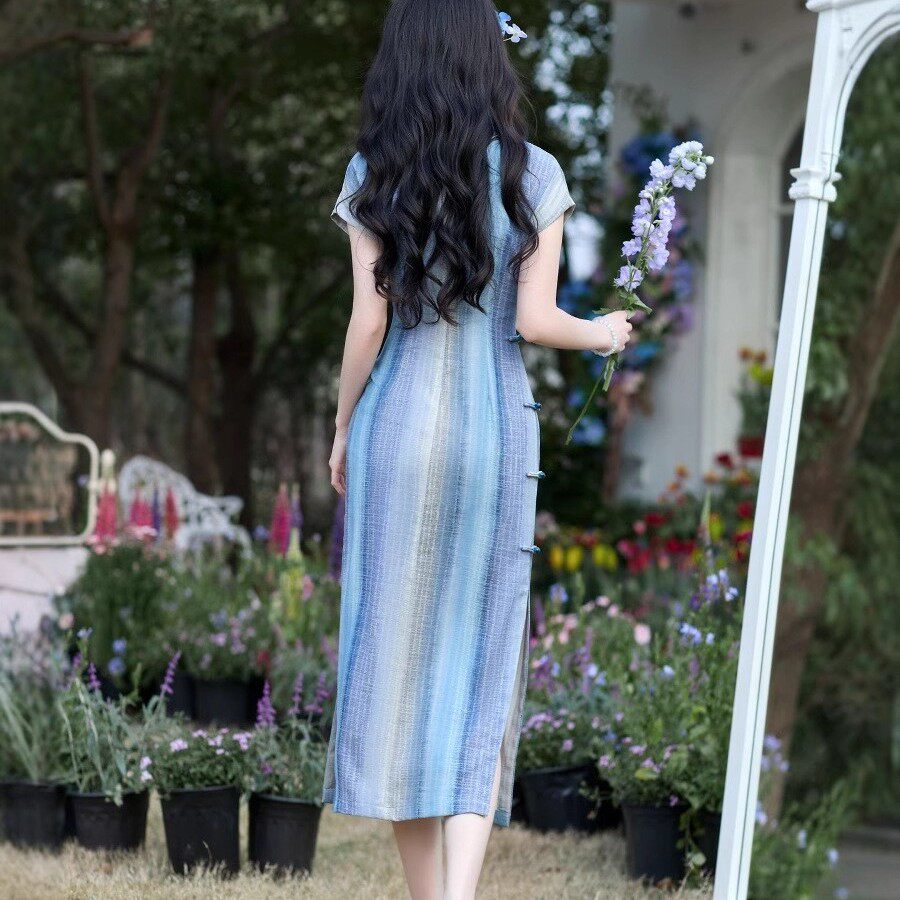 📚 民国复古春夏日常少女书卷气古法旗袍灰蓝条纹大学生上班可穿