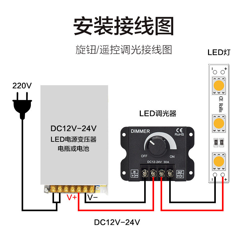 📚 led调光器亮度调节控制DIMMER旋钮调压无极开关DC12V-24V 30A直流