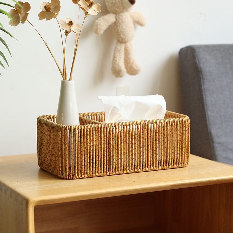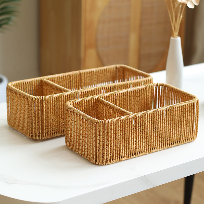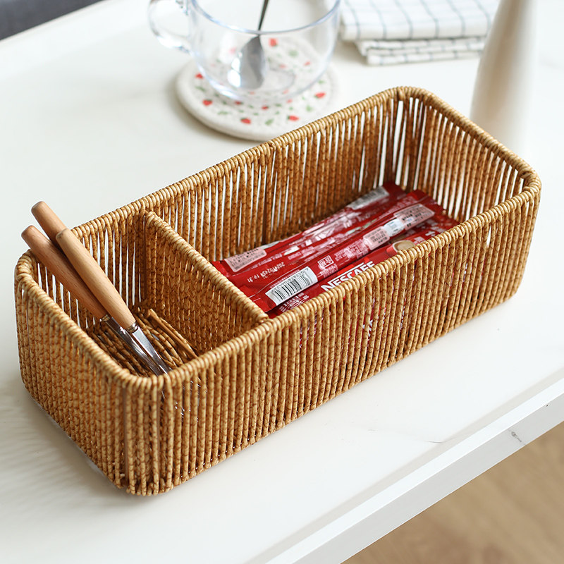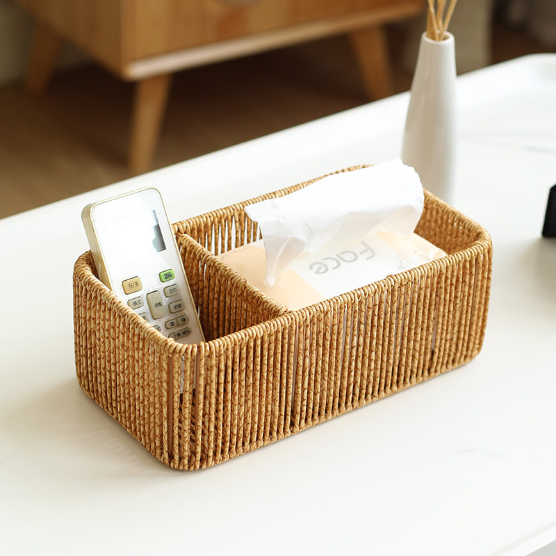 📚 桌面杂物收纳盒茶几上遥控器数据线整理钥匙创意仿藤编分格储物盒