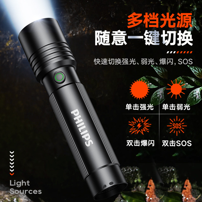 📚 飞利浦手电筒强光超亮远射户外便携超长续航铝合金防水工作灯家用