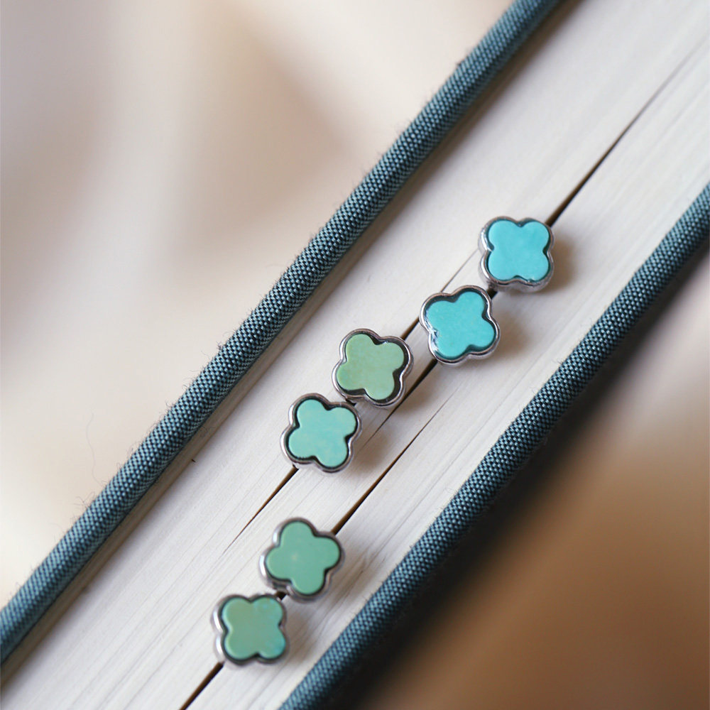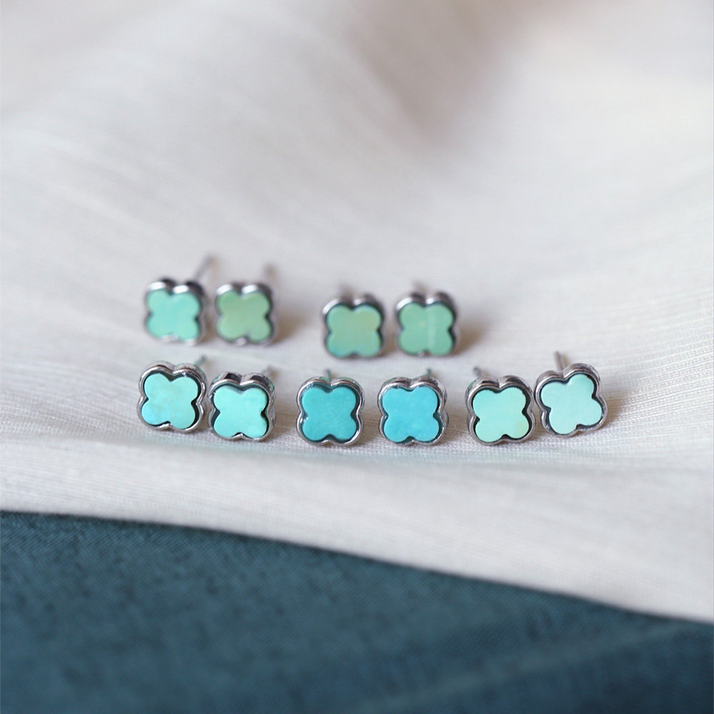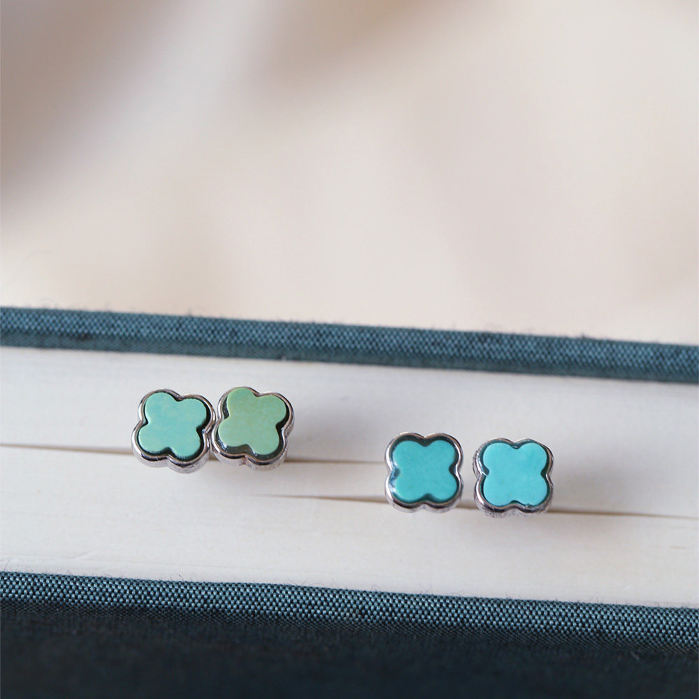 📚 天然原矿绿松石四叶草款纯银镶嵌耳钉 女款镶嵌款松石耳钉饰品