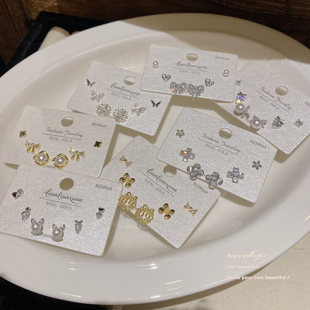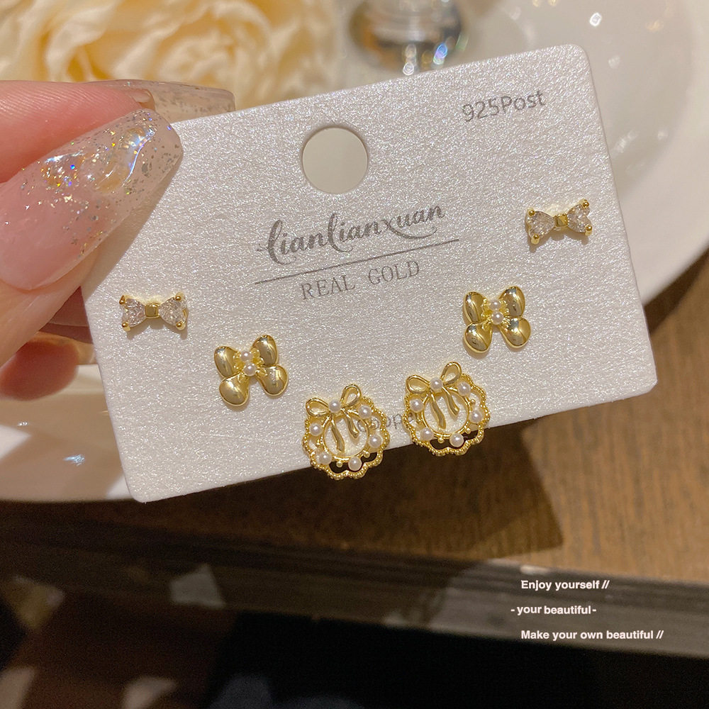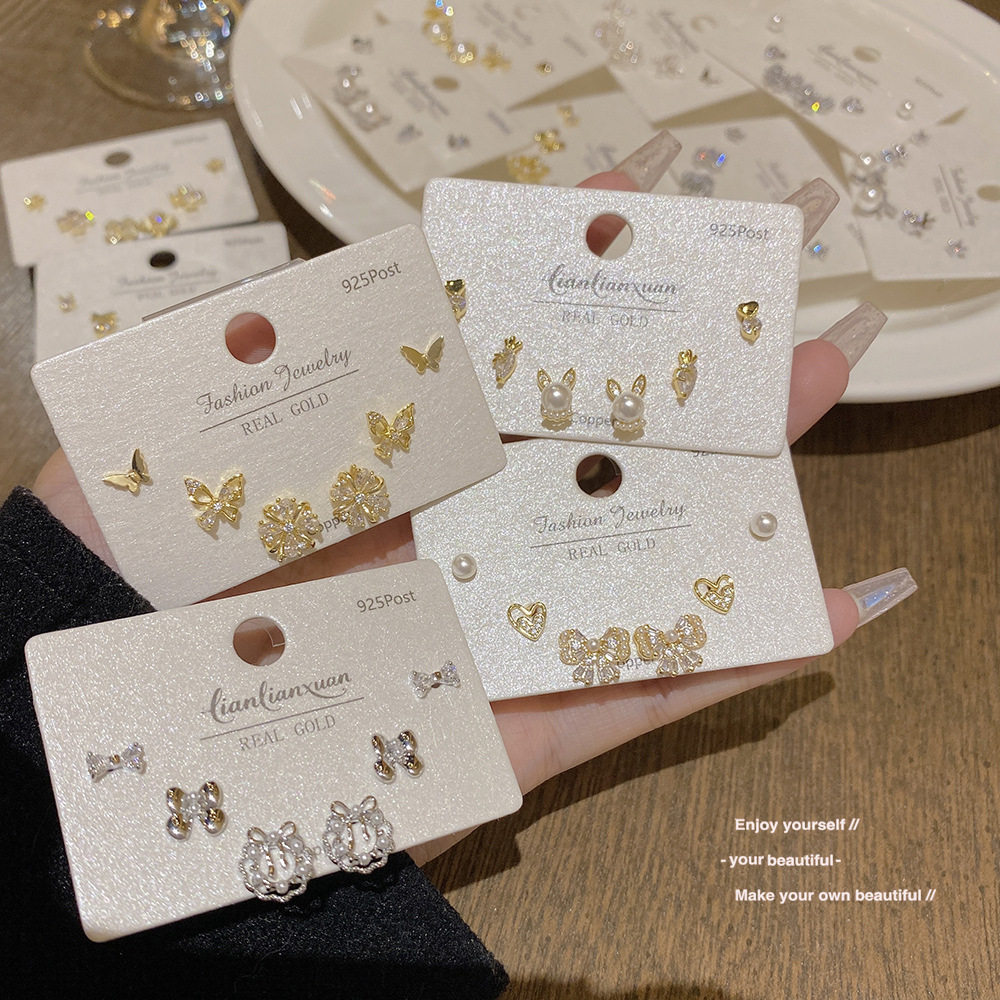 📚 S925银针真金电镀一卡三对耳钉女套装小巧精致耳环高级感珍珠耳饰