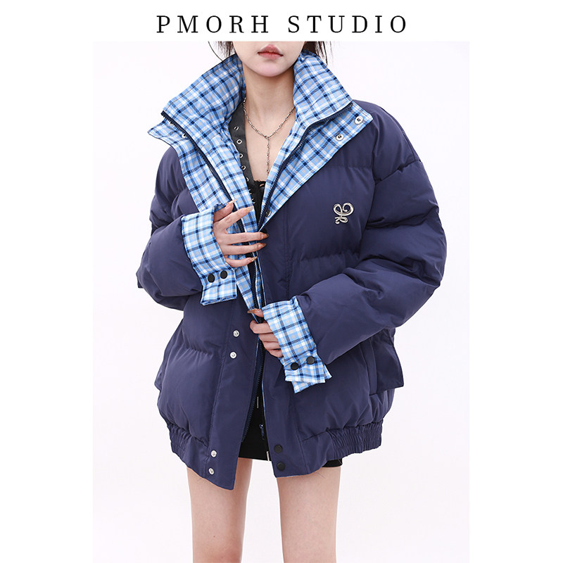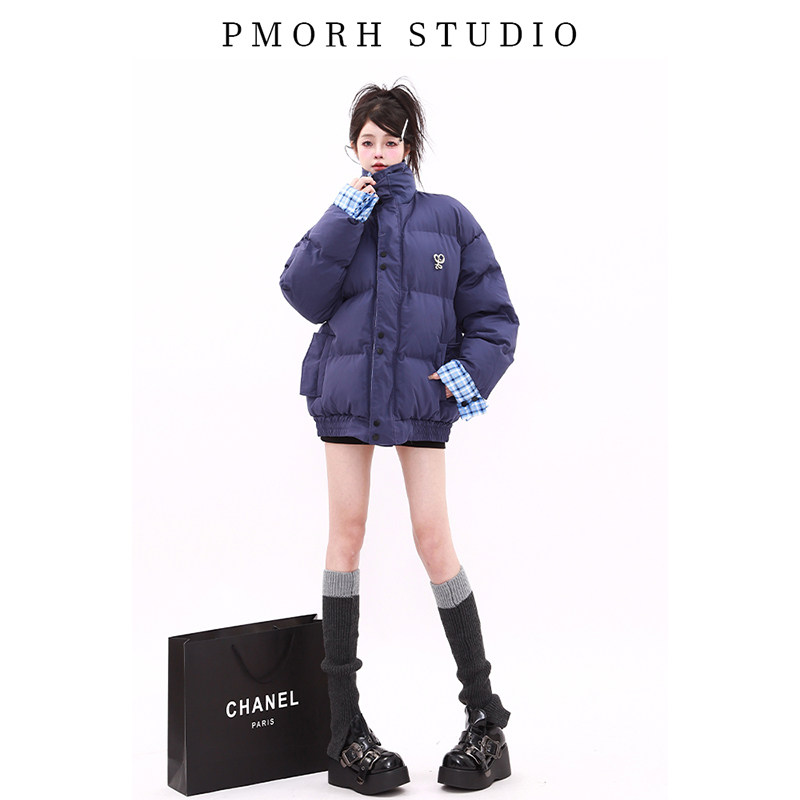 📚 PMORH美式假两件格子拼接羽绒棉服女款春季加厚面包服棉衣棉外套