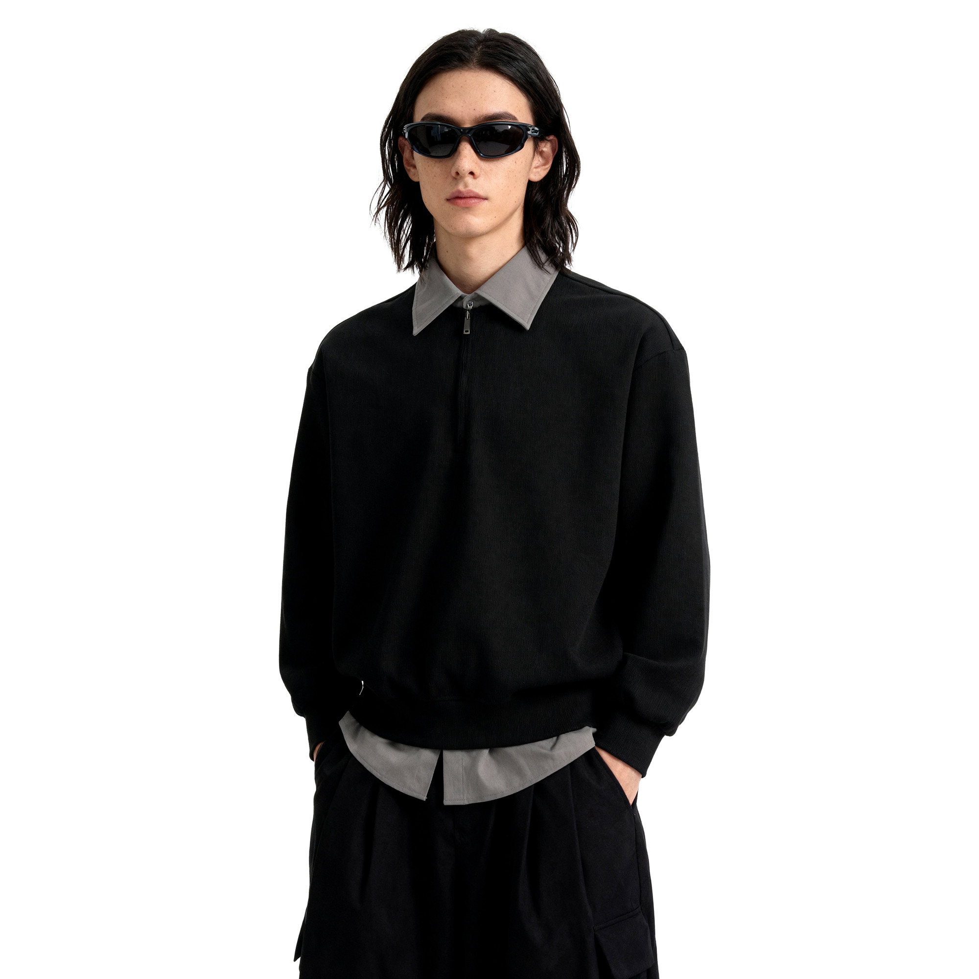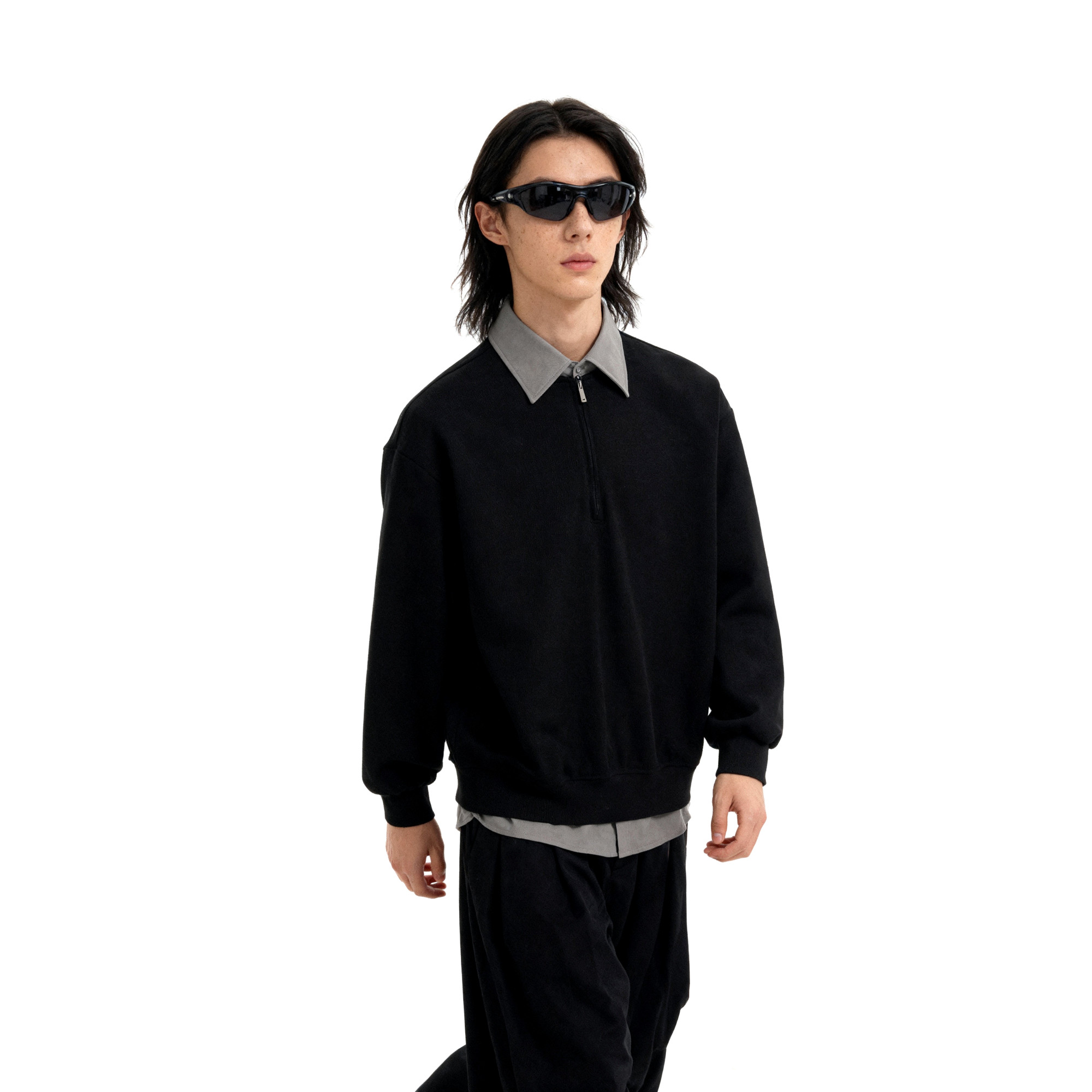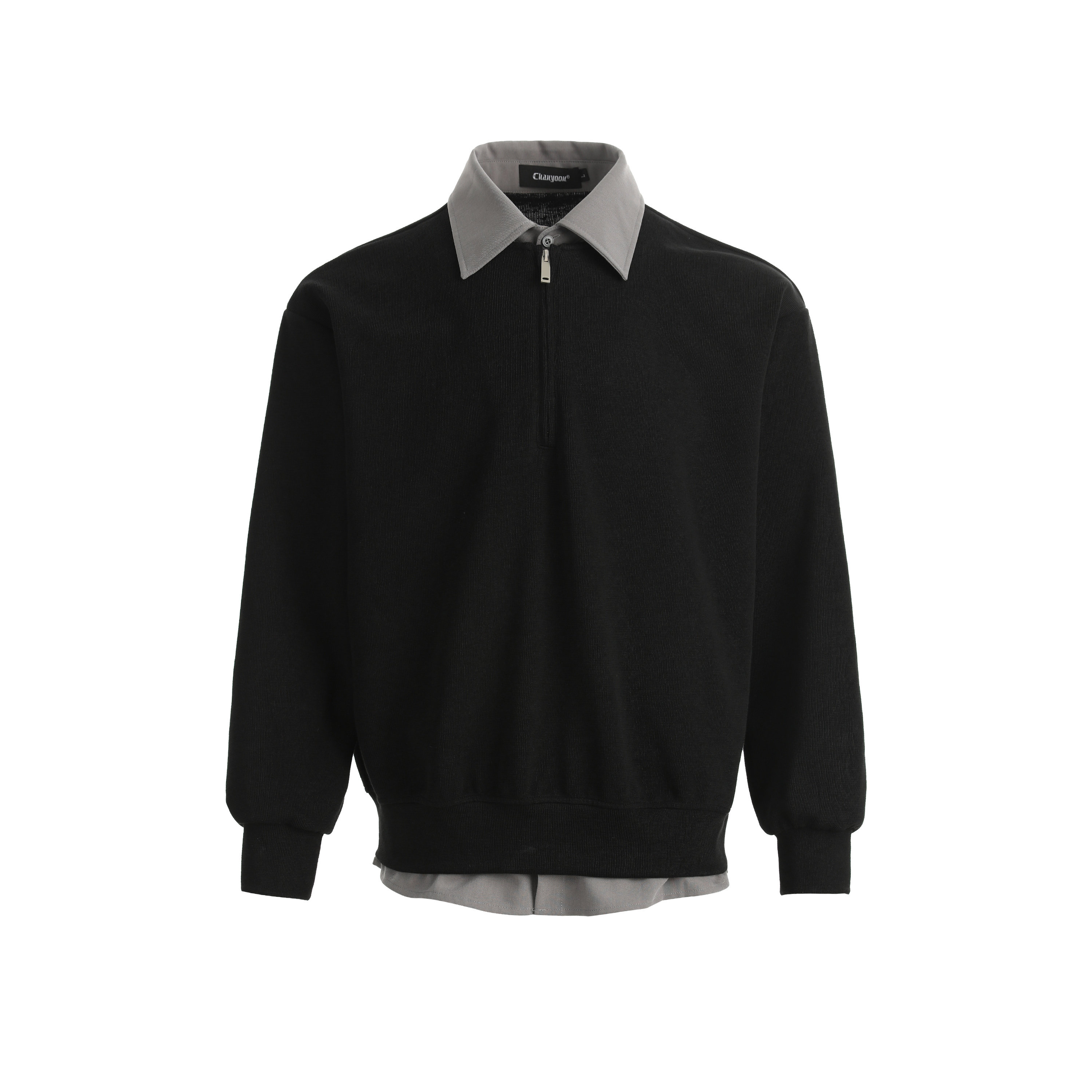 📚 短句先生黑灰撞色半开领假两件衬衫上衣