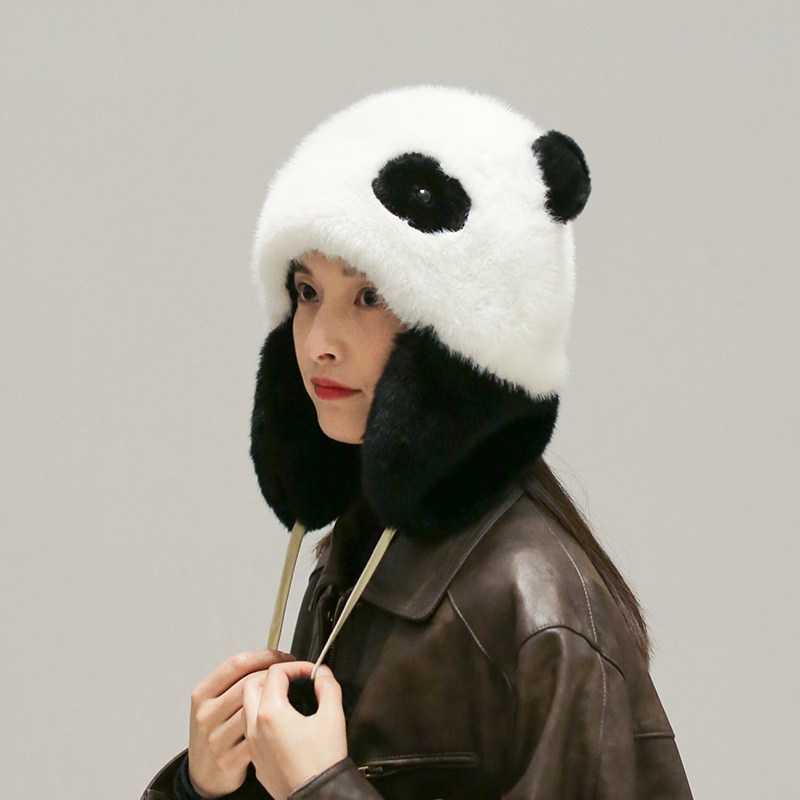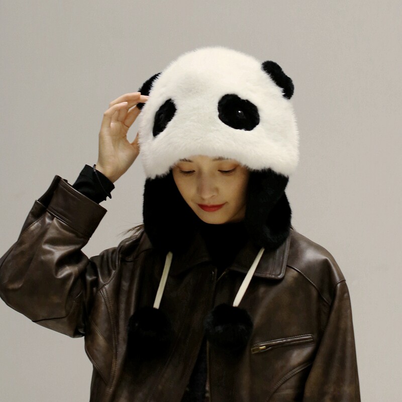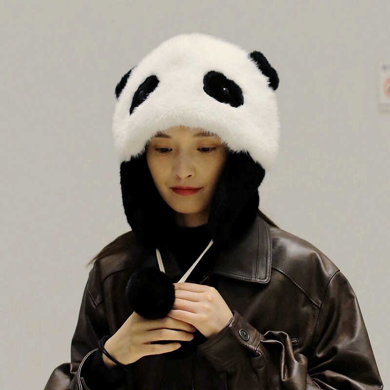 📚 黑白拼色可爱卡通熊猫女冬天防寒头套帽子护耳雷锋帽软萌毛绒手套