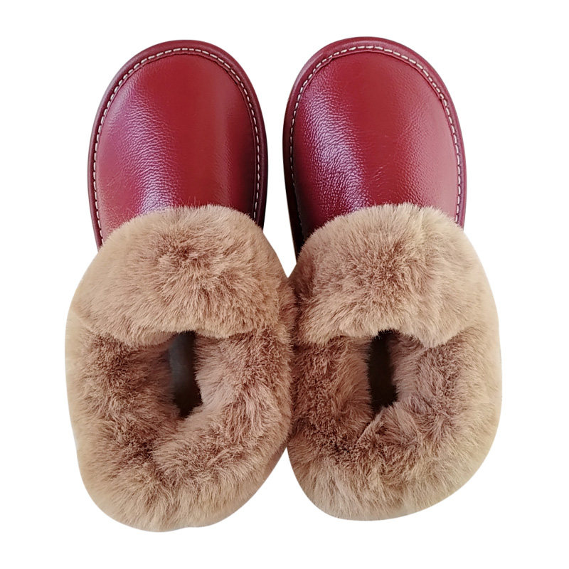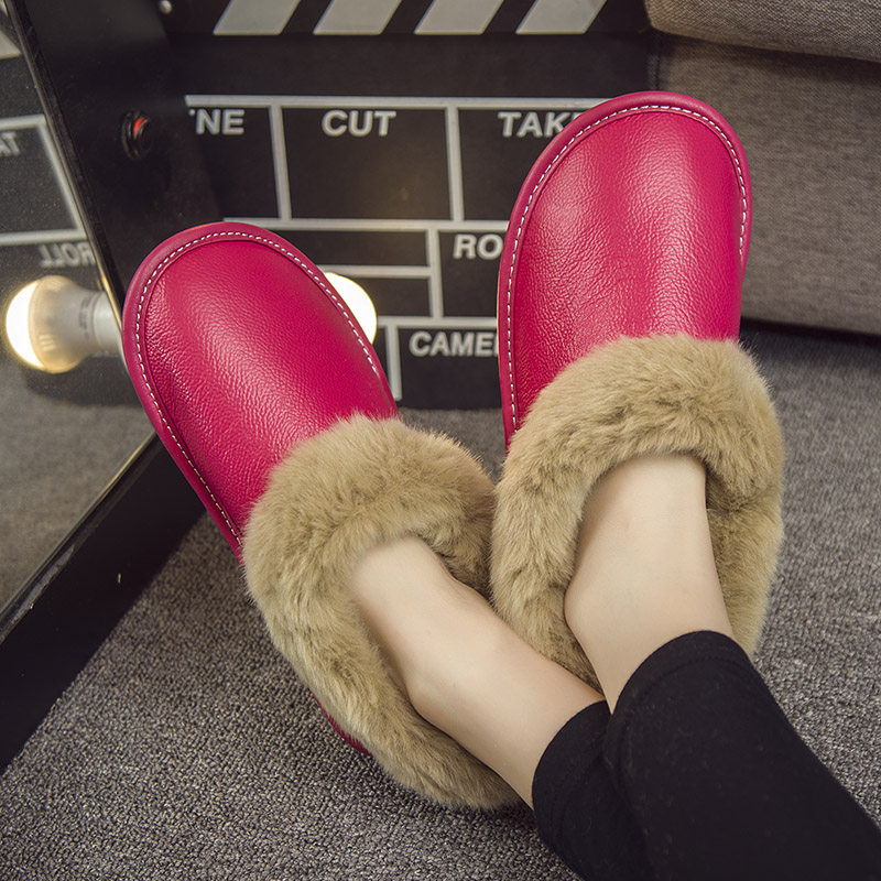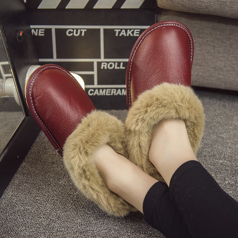 📚 家居冬季棉拖鞋男女真牛皮面冬天室内家用防滑水带包跟毛绒保暖鞋