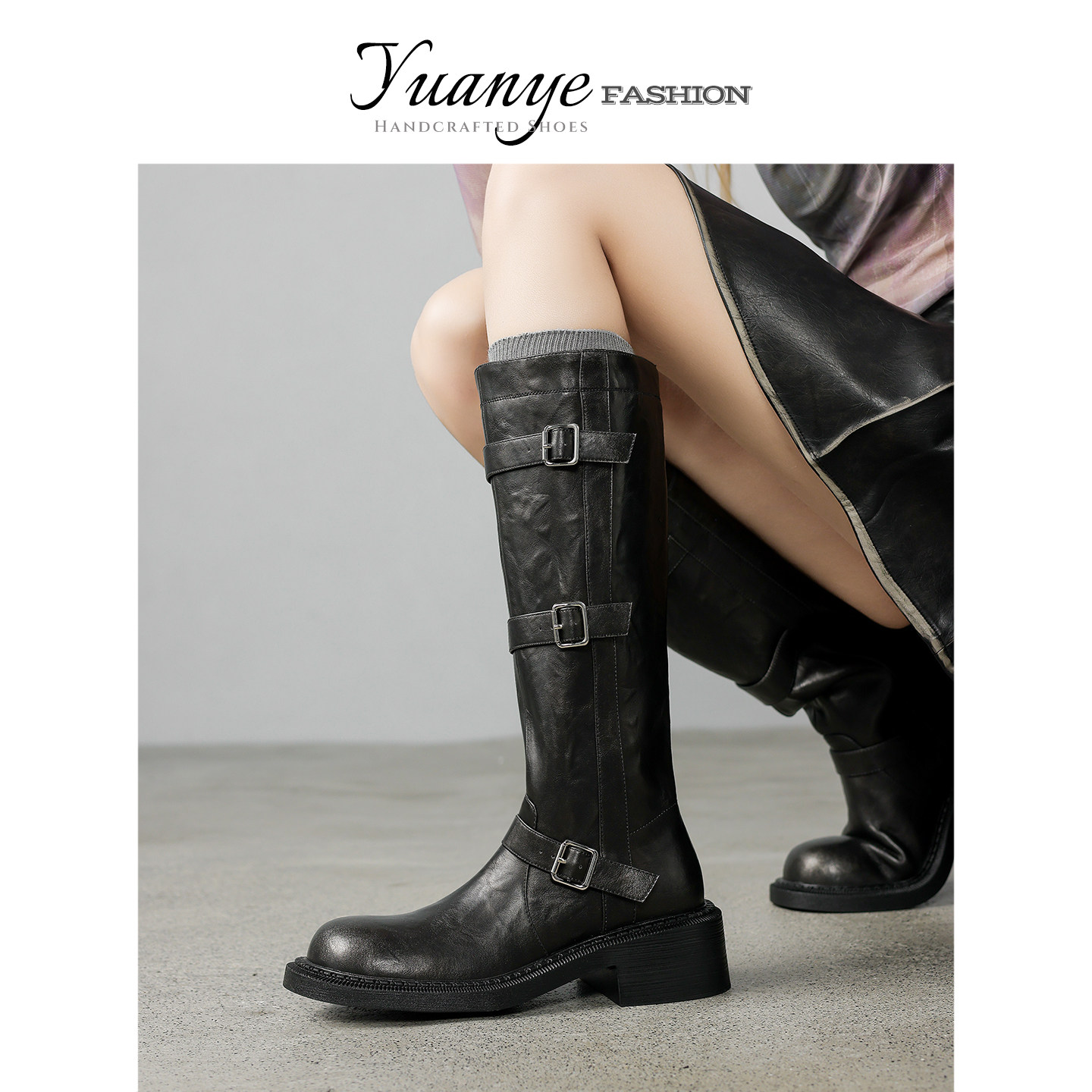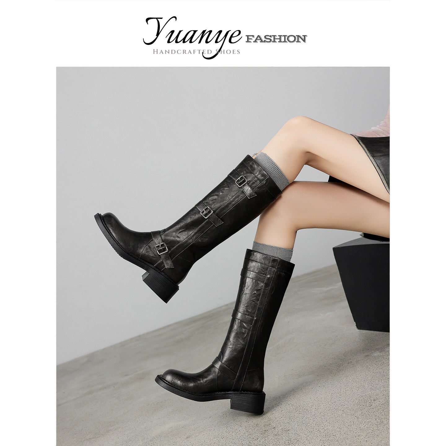 📚 原野Yuanye●步履成诗!真皮高筒粗跟骑士靴女显瘦圆头不过膝长靴