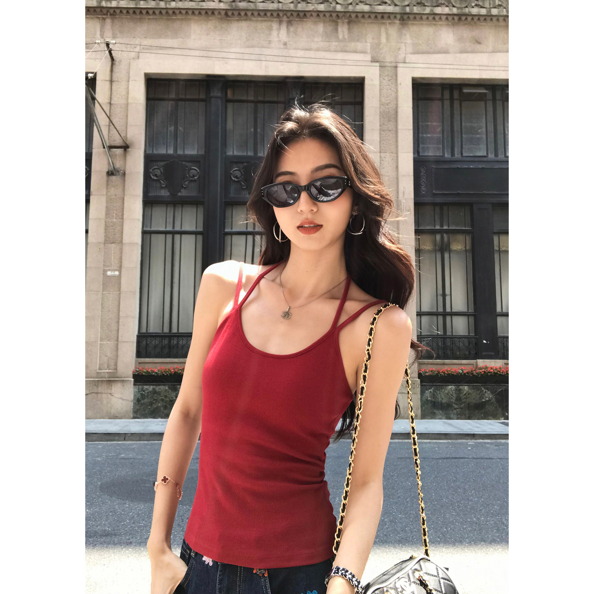 📚 MULVAN 心动crush 双肩带吊带背心女带胸垫夏季修身红色内搭上衣