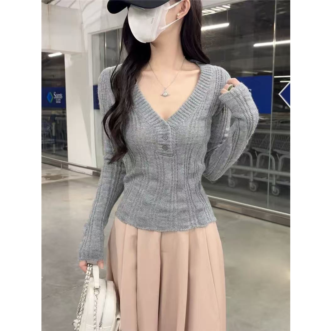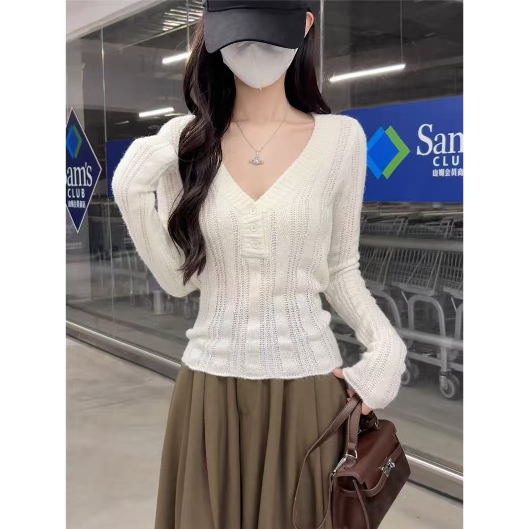 📚 MosesQueen魔西女王镂空V领毛针织衫甜美藕粉修身温柔长袖毛衣