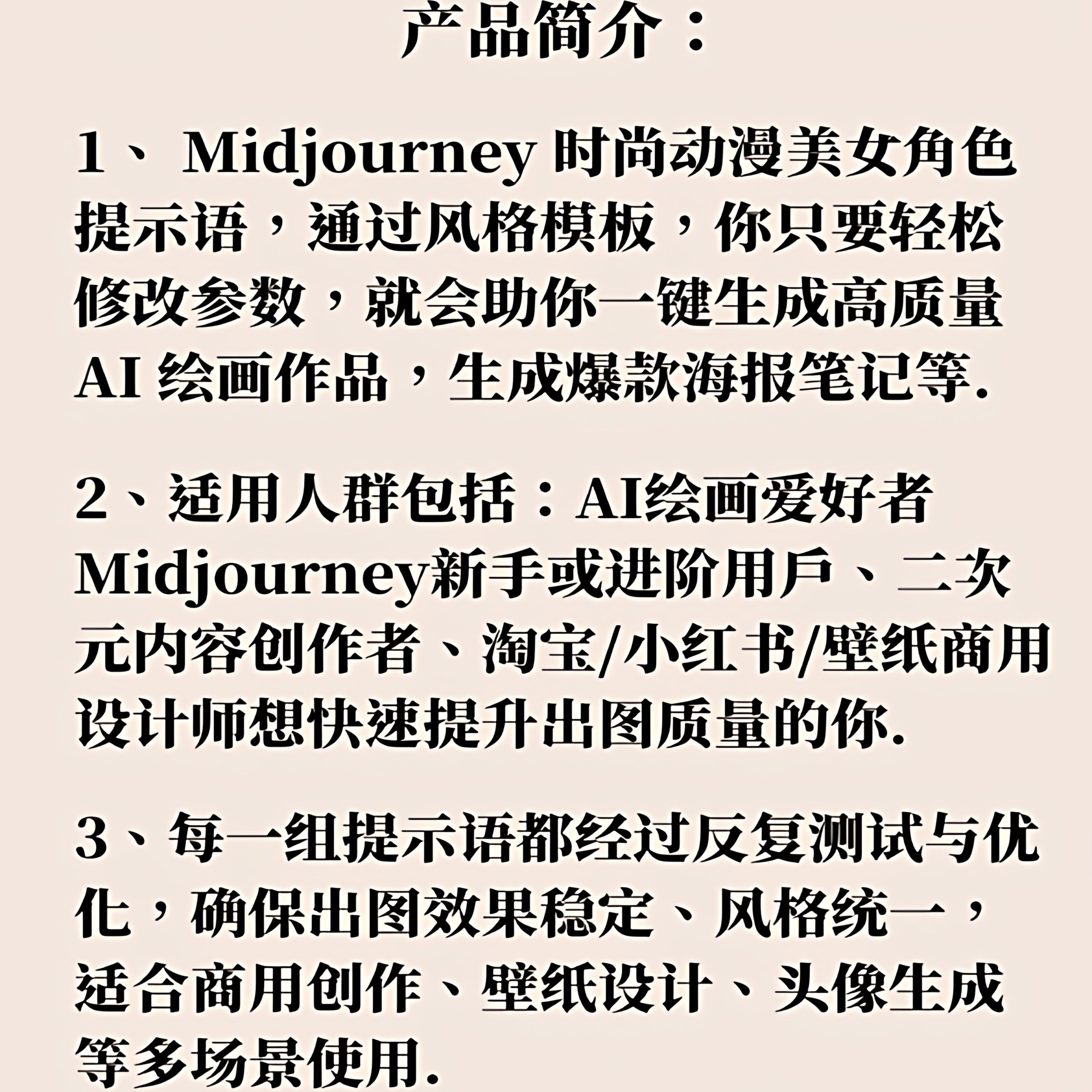 📣最后,我要分享一个好标题:《Midjourney动漫美女角色AI绘画提示词模板,让你一秒变身时尚动漫美少女!券后价6.8元,快来试试吧!》