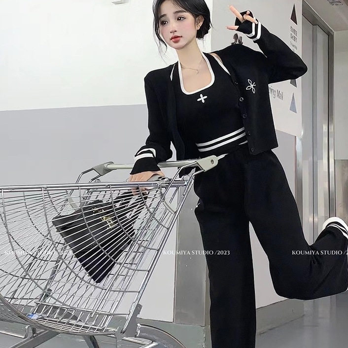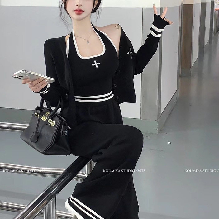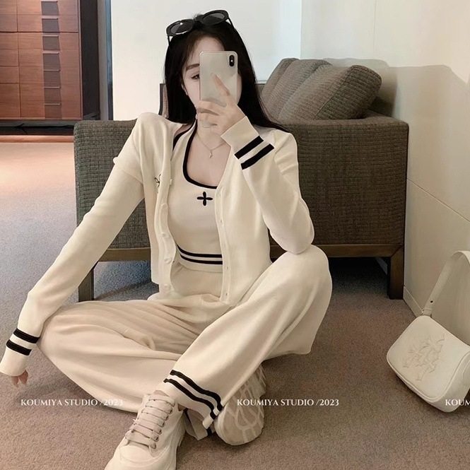 📚 温柔系网红炸街针织套装休闲时尚十字架拼色背心开衫长裤三件套