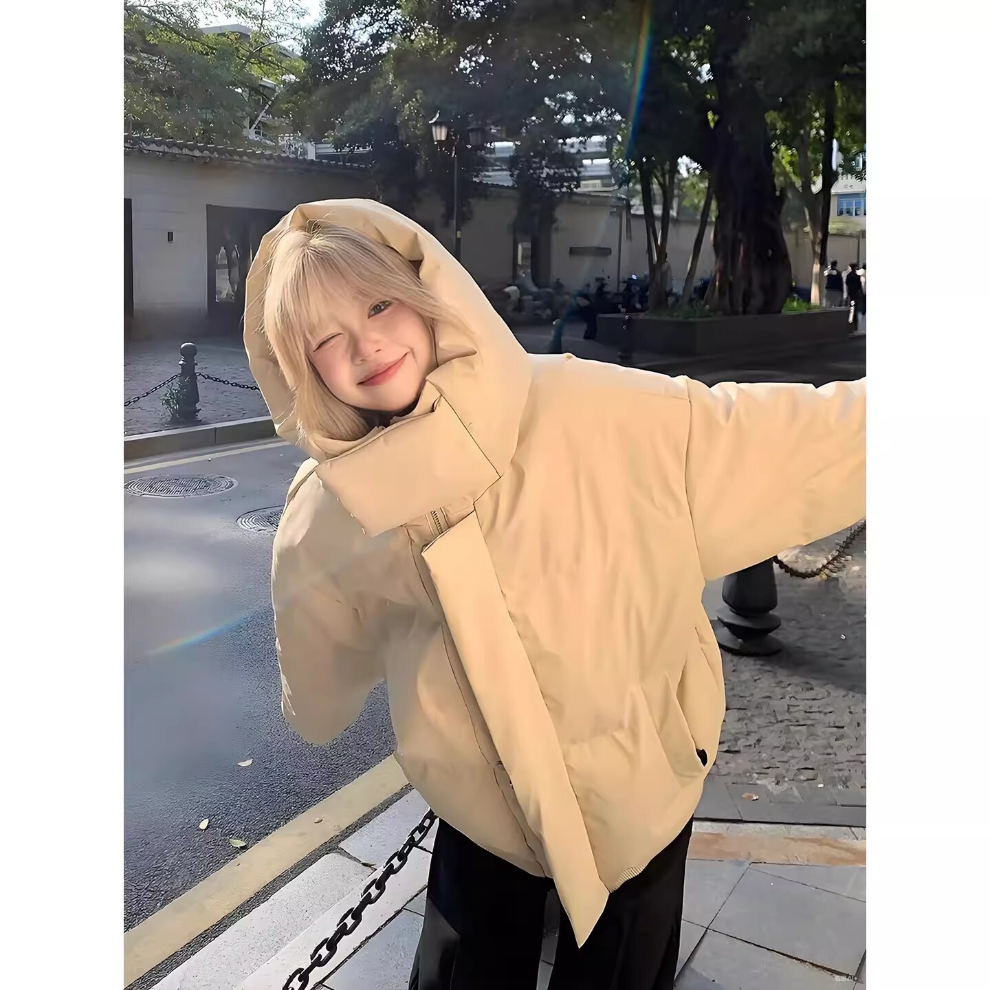 📚 米白色pu皮羽绒棉服男女冬季立领连帽加厚棉衣外套情侣短款面包服