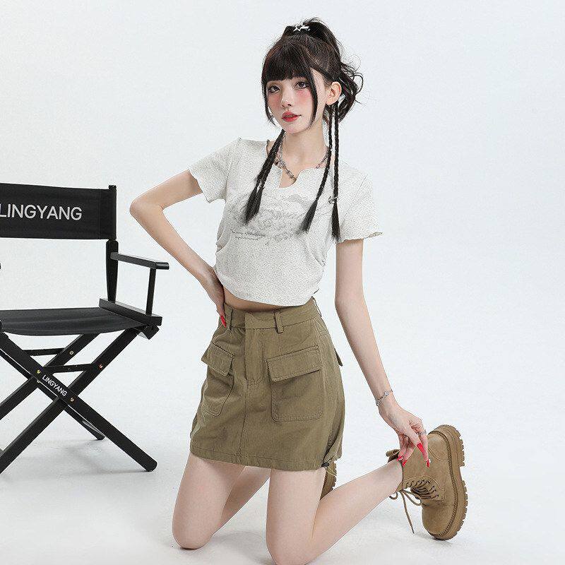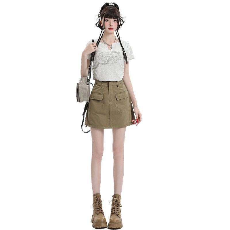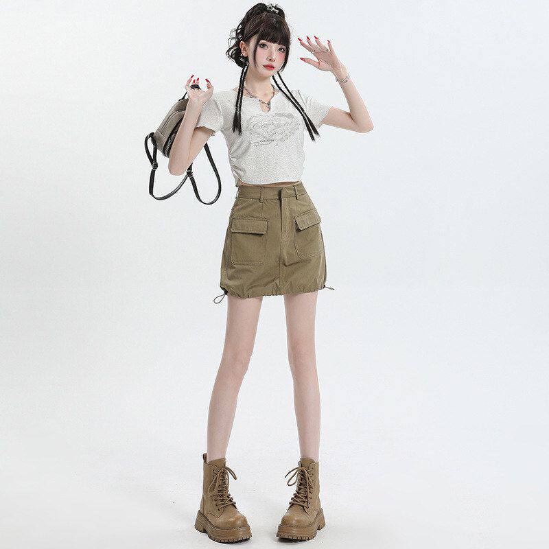 📚 JZ美式辣妹工装裙女春小个子短裙高腰显瘦a字半身抽绳包臀裙女夏