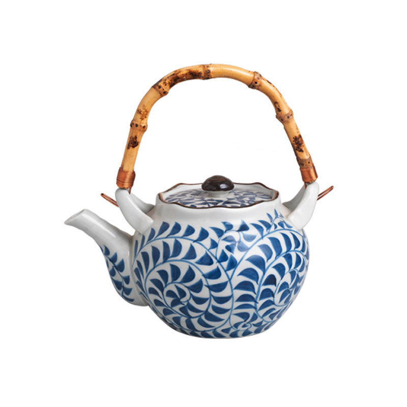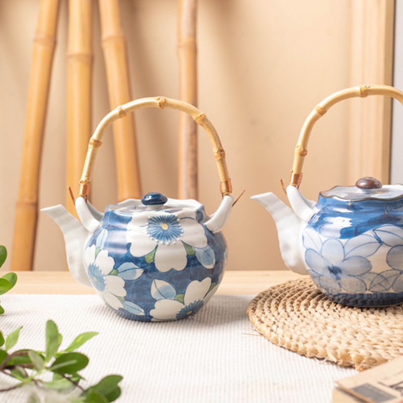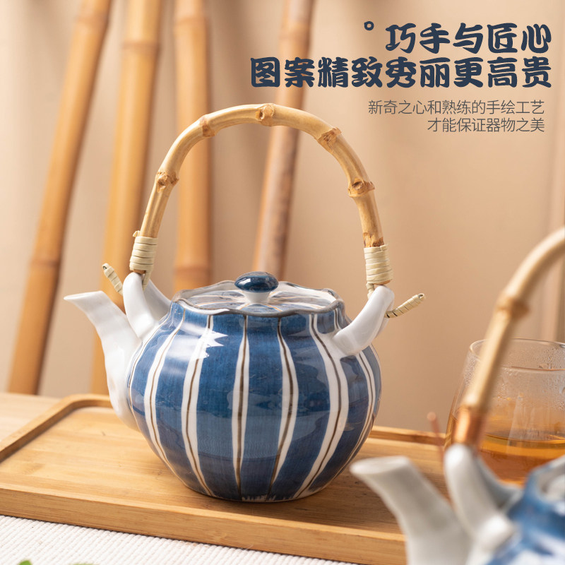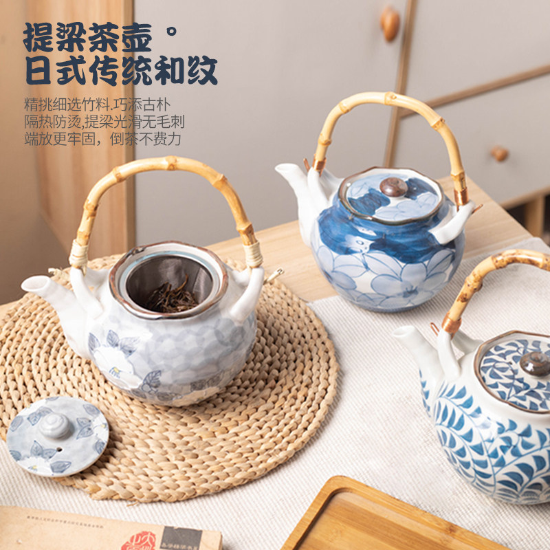📚 虎山窑日式手绘提梁壶釉下彩复古陶瓷茶壶壶盖带滤网功夫茶具套装