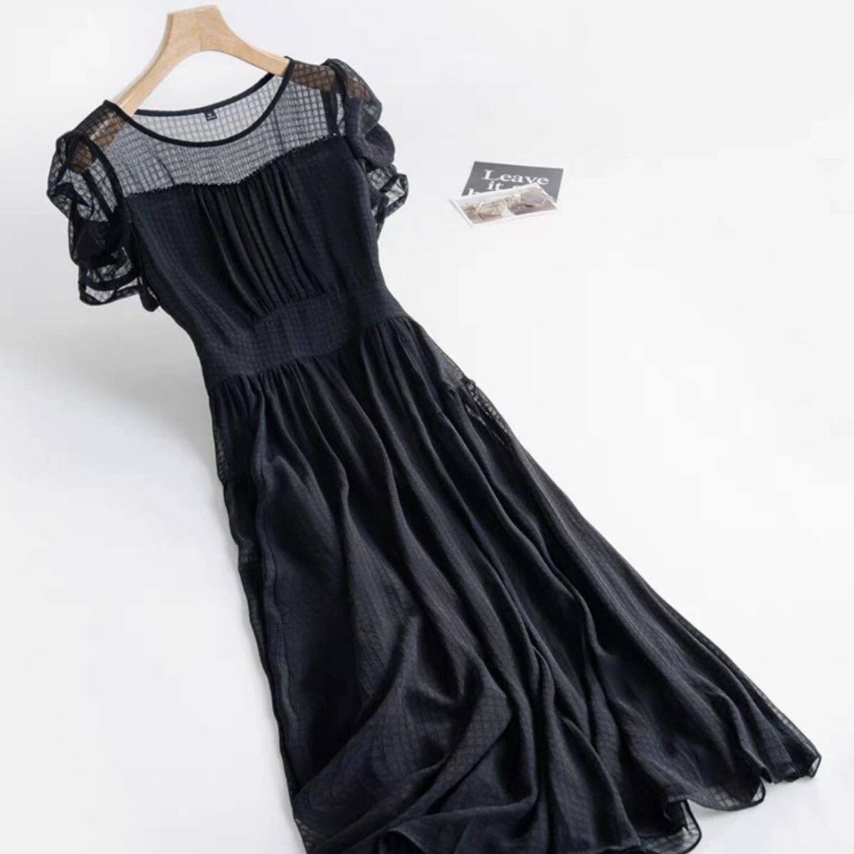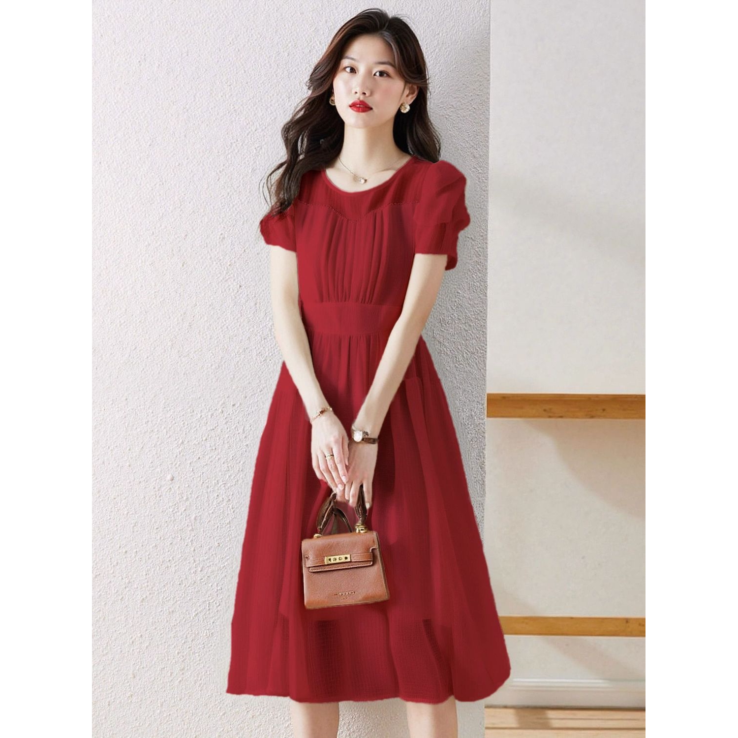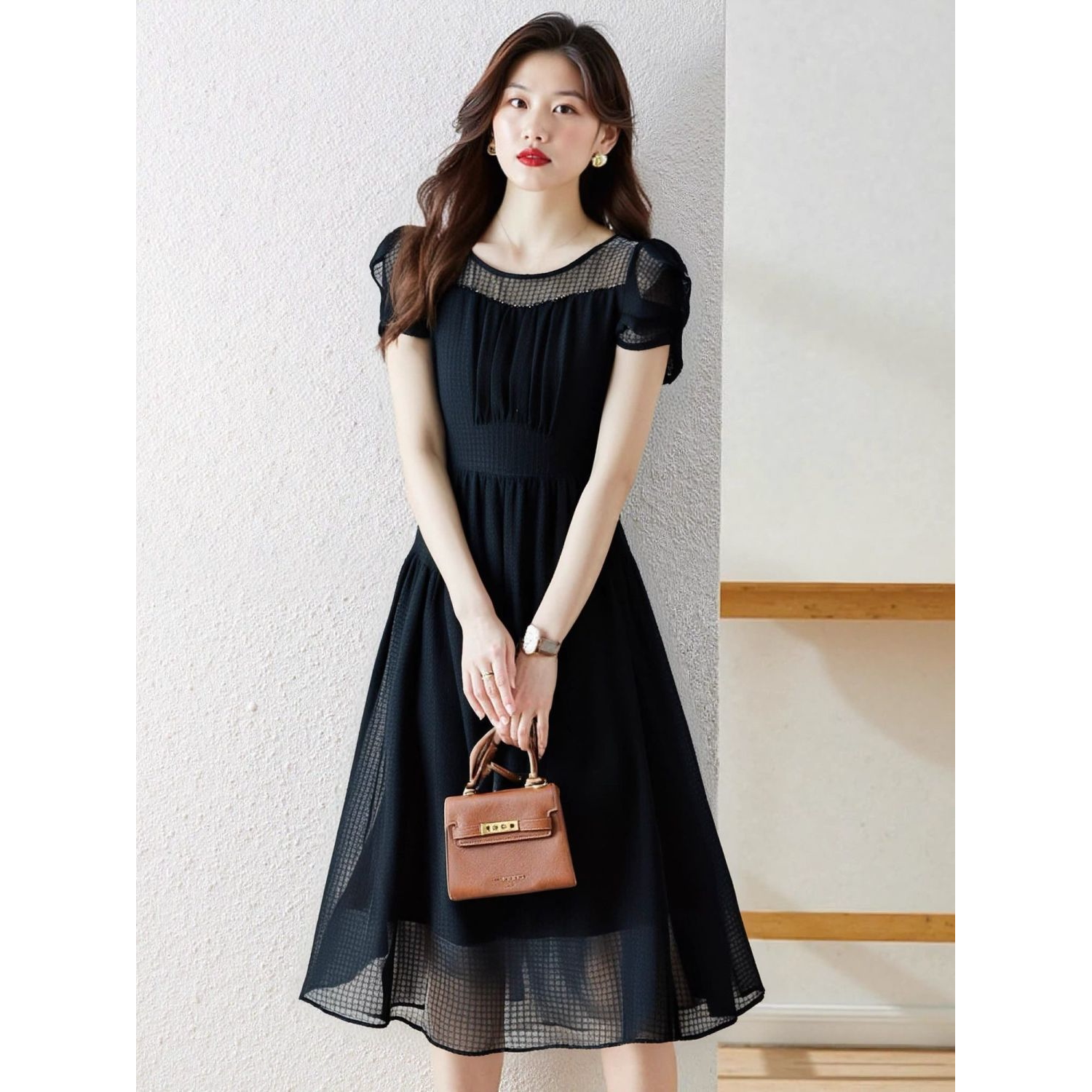 📚 L171夏季2026新款纯色圆领百搭堆堆袖拼接显瘦收腰气质长款连衣裙