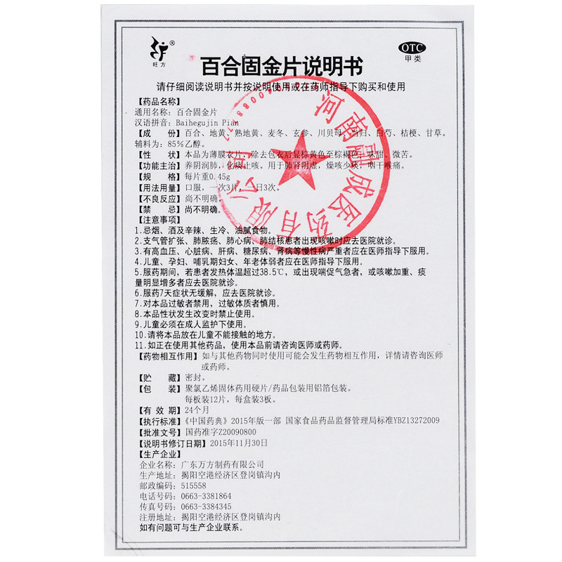 📚 旺方 百合固金片 0.45g*36片/盒养阴润肺化痰止咳咽干喉痛 正品