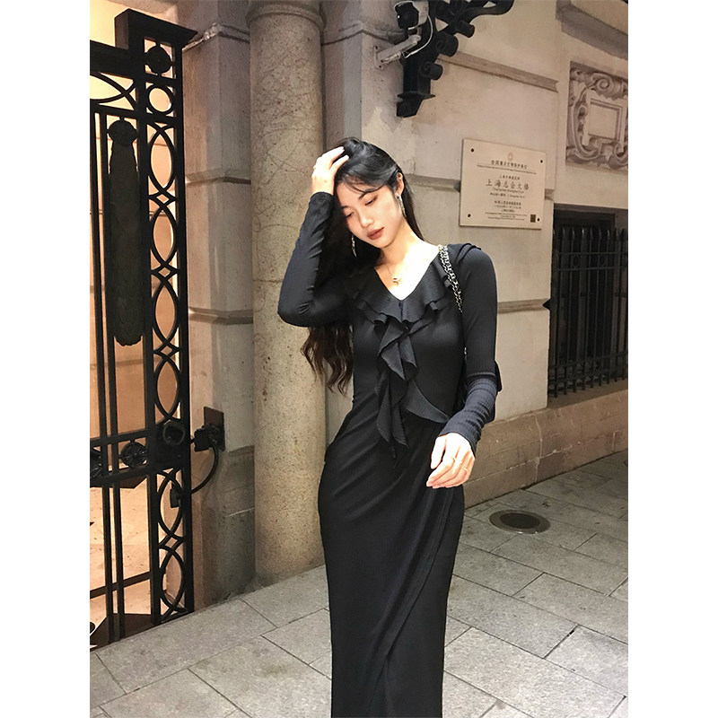 📚 【现货5折清仓】Norain不下雨 法式v领黑色针织长袖连衣裙