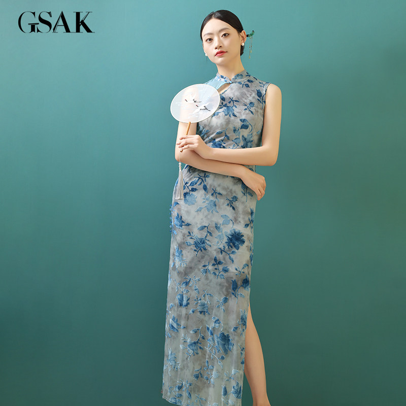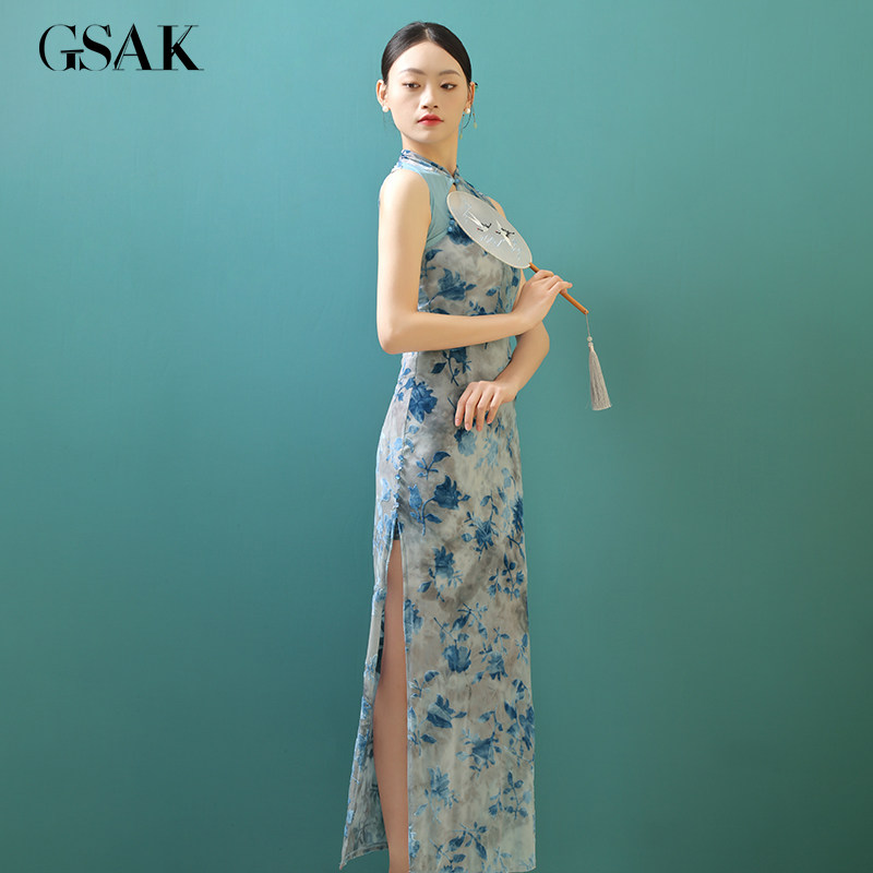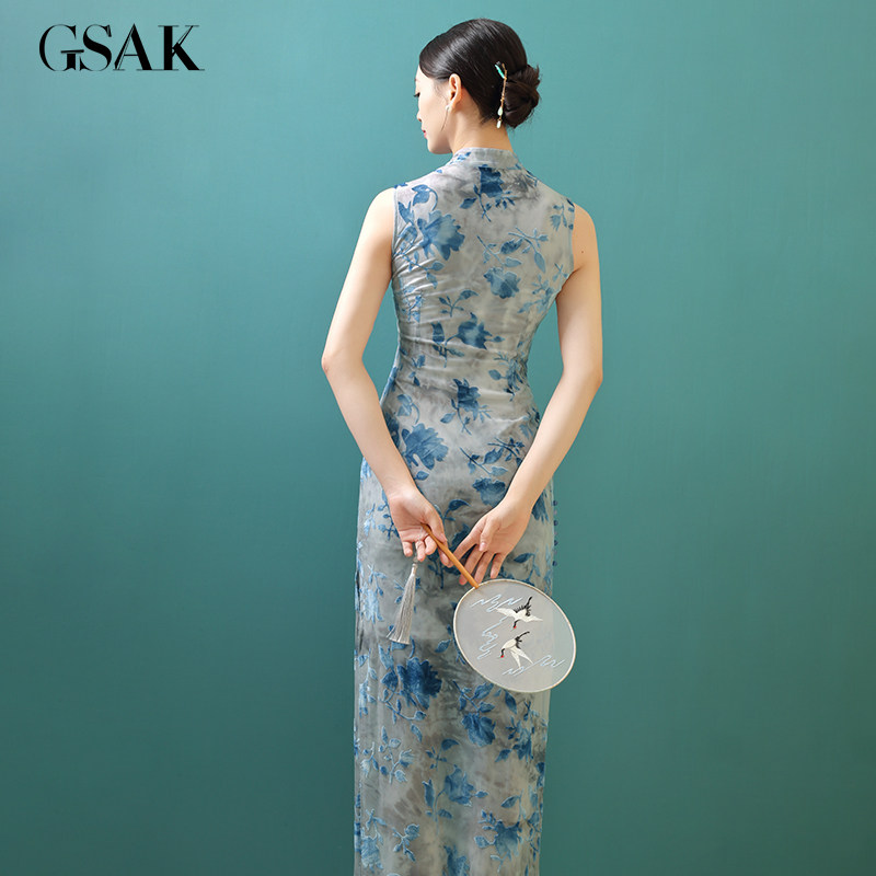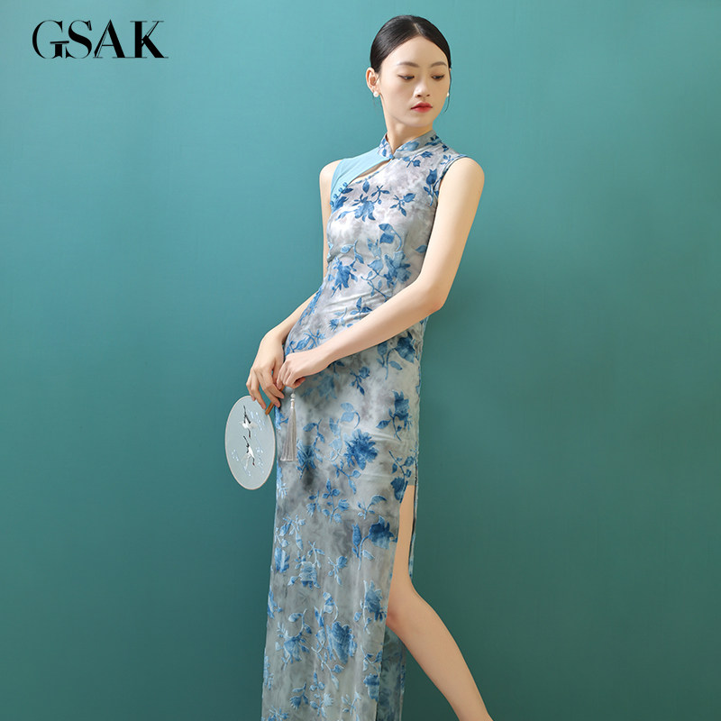 📚 GSAK复古小立领改良旗袍花色丝绒性感开衩显瘦年轻款连衣裙日常女