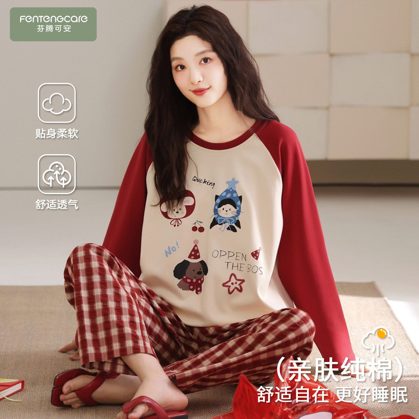 📚 芬腾可安睡衣女款冬季纯棉布料100全棉女士长袖格子家居服春秋天