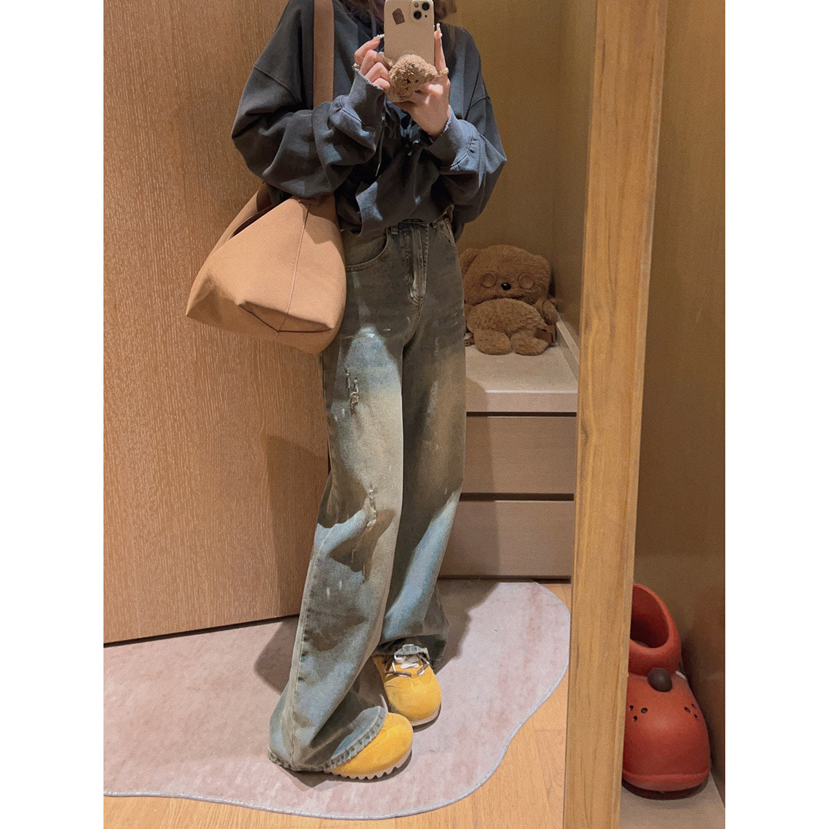 📚 Yukiss 做旧复古加绒微喇阔腿直筒牛仔裤女秋韩系宽松高腰休闲裤