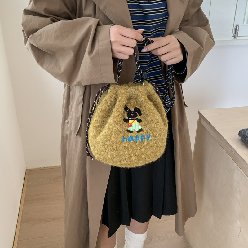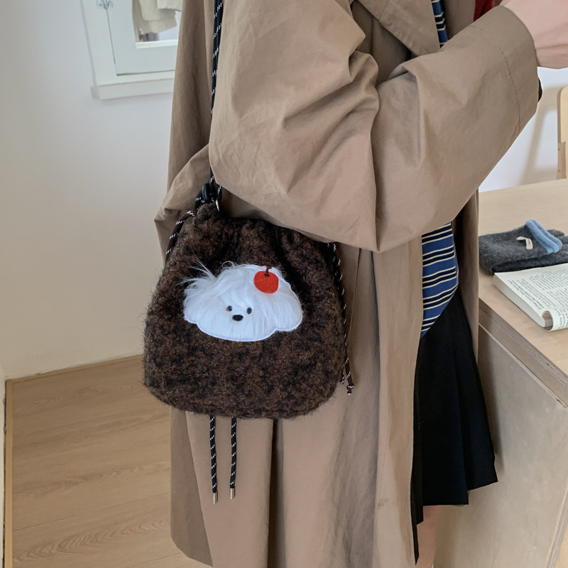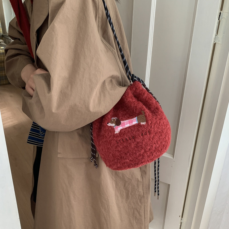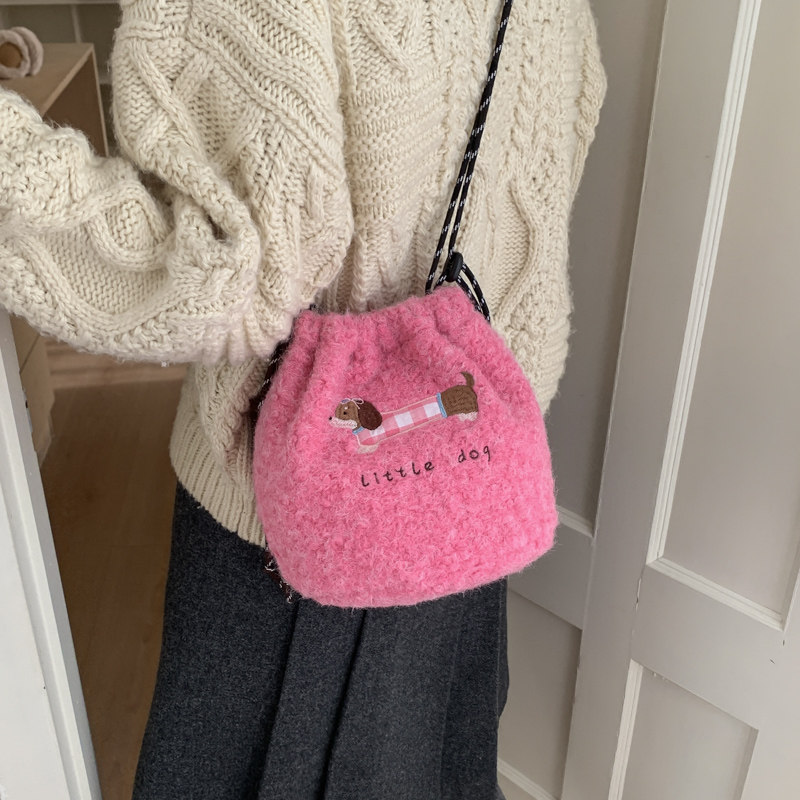 📚 卡通小狗刺绣毛绒束口水桶包女2025秋冬百搭斜挎包可爱软糯单肩包