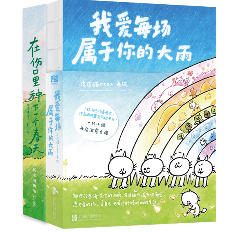 📚 【皮皮猫meow作品】我爱每场属于你的大雨+在伤口里种下一个春天 一只小猫X迷你拇指书 关于猫的故事国漫动漫绘本漫画书籍