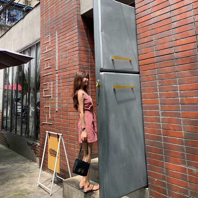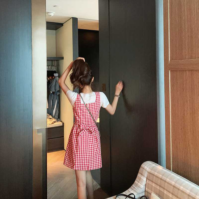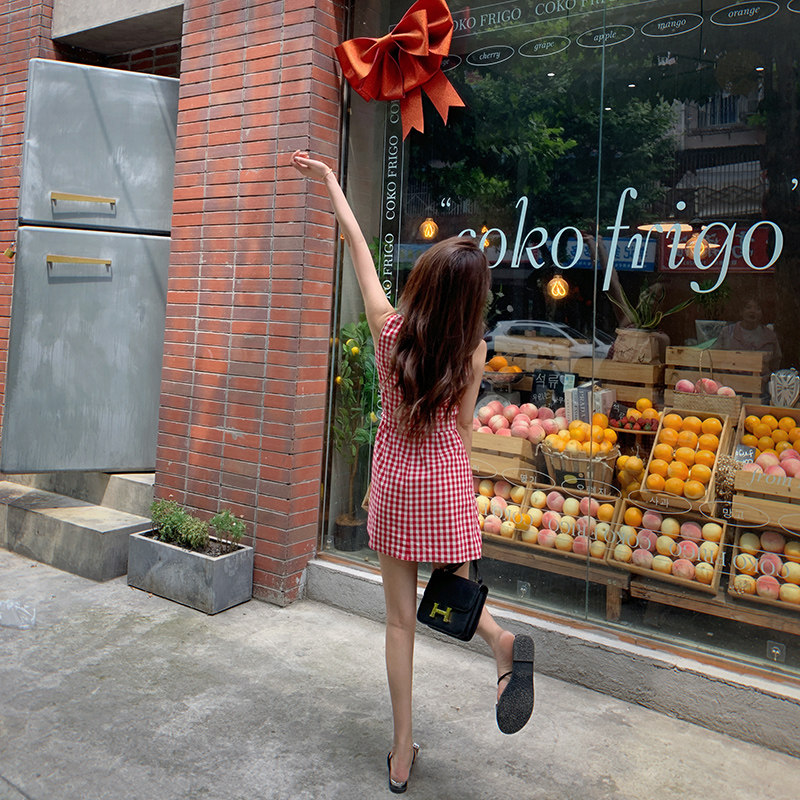 📚 bigyu 红色格子无袖连衣裙全棉显瘦方领系带百搭短款小个子背心裙