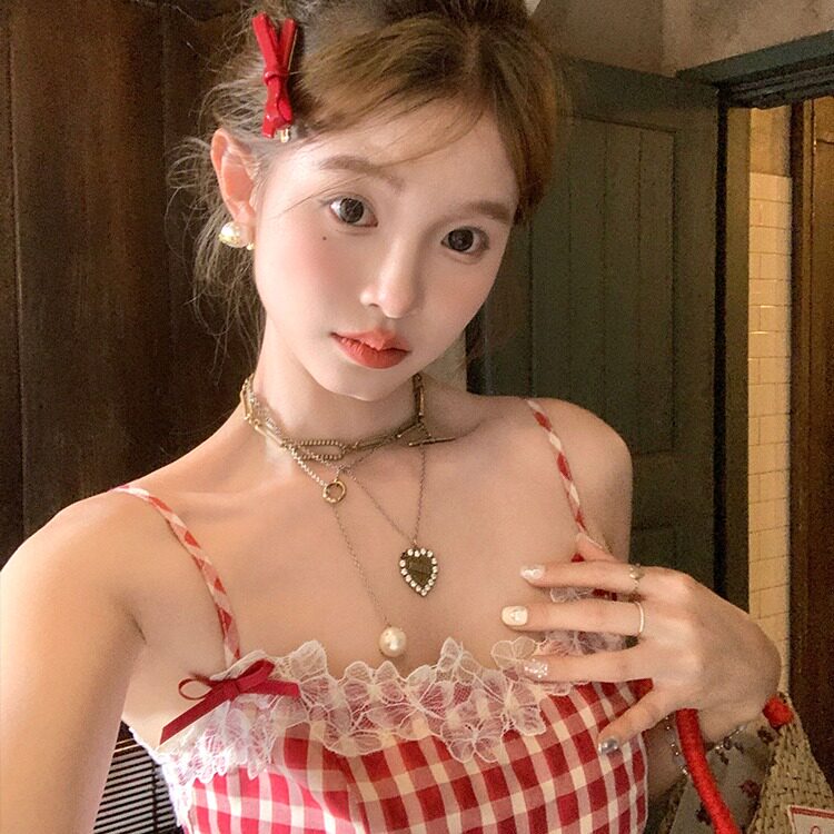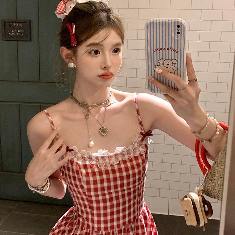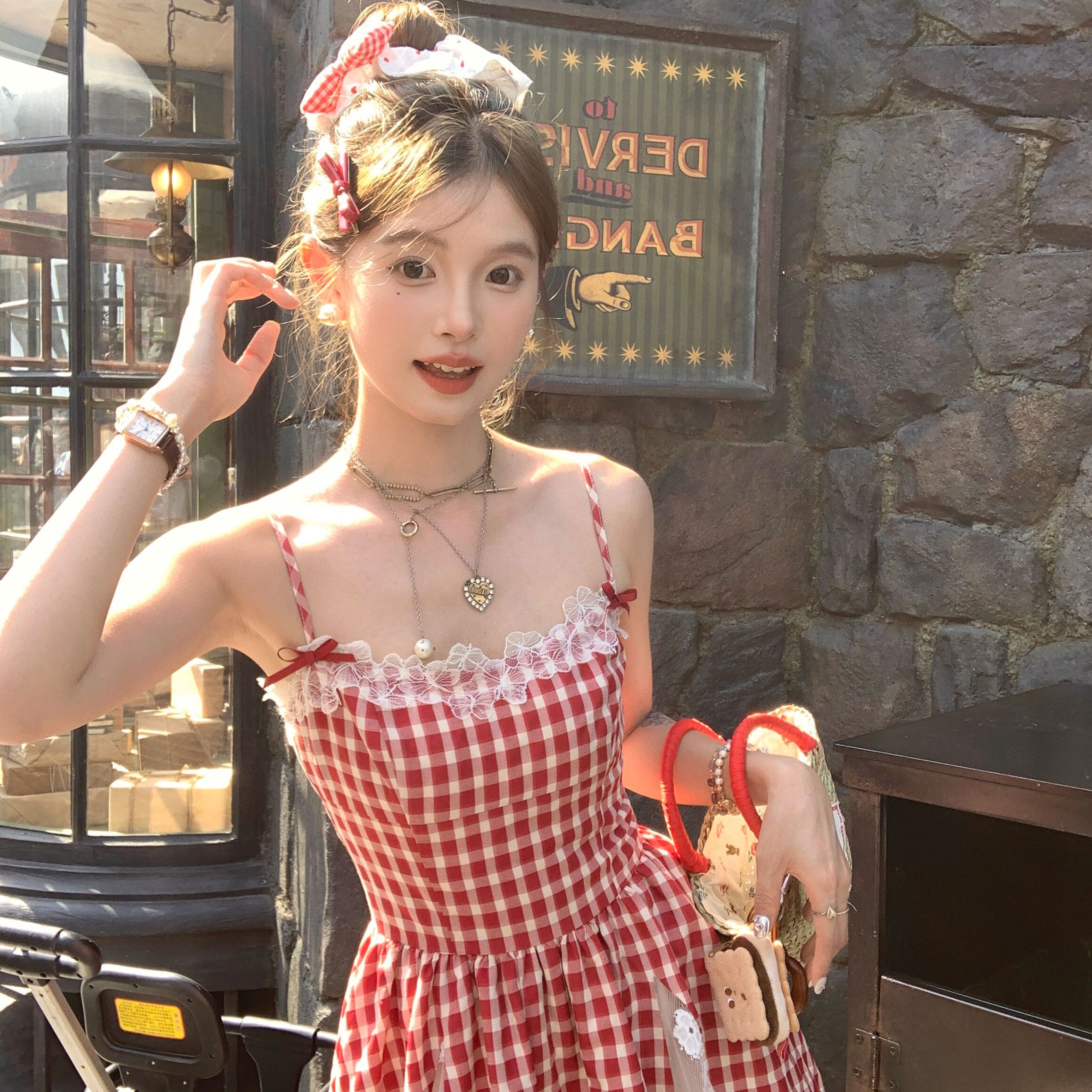 📚 Acaine中长款红色格子吊带a字连衣裙女夏季法式甜美小个子裙子