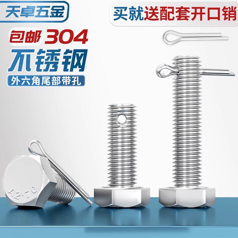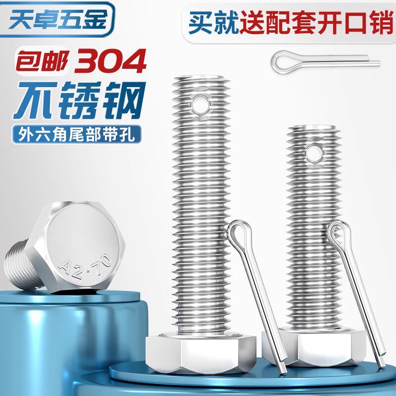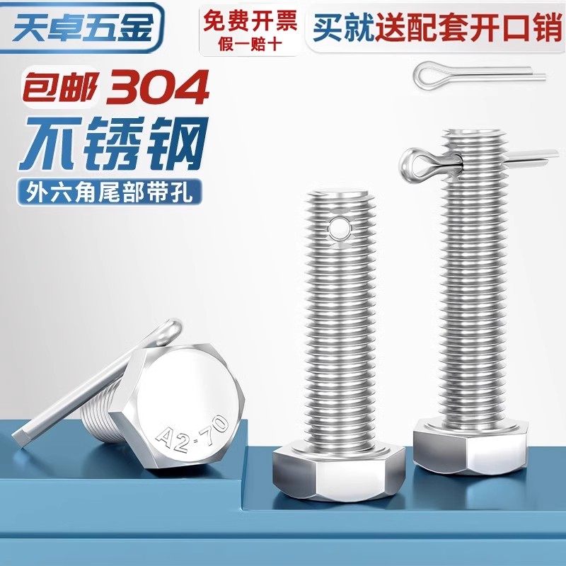 📚 M6-M16 304不锈钢尾部带孔外六角螺丝GB31.1螺杆带孔杆身打孔螺栓