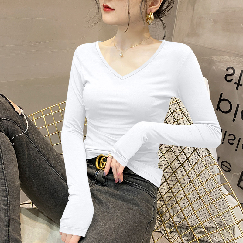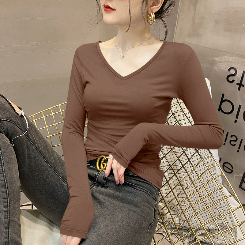 📚 莫代尔V领长袖t恤女秋冬内搭修身显瘦打底衫鸡心领可外穿正肩上衣