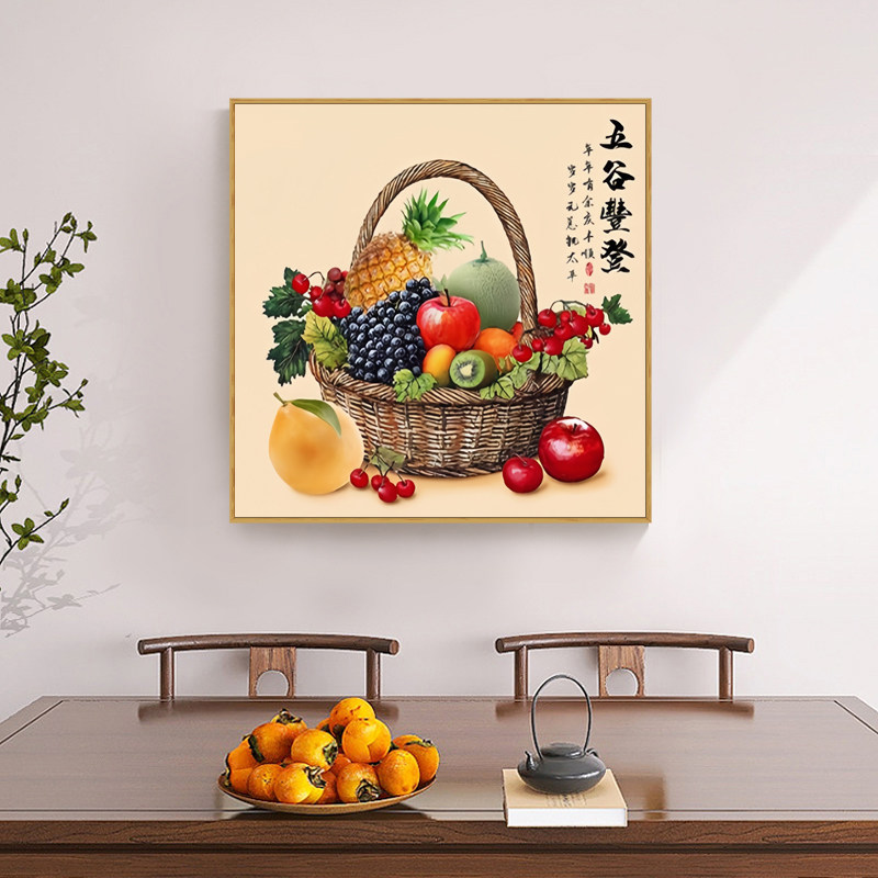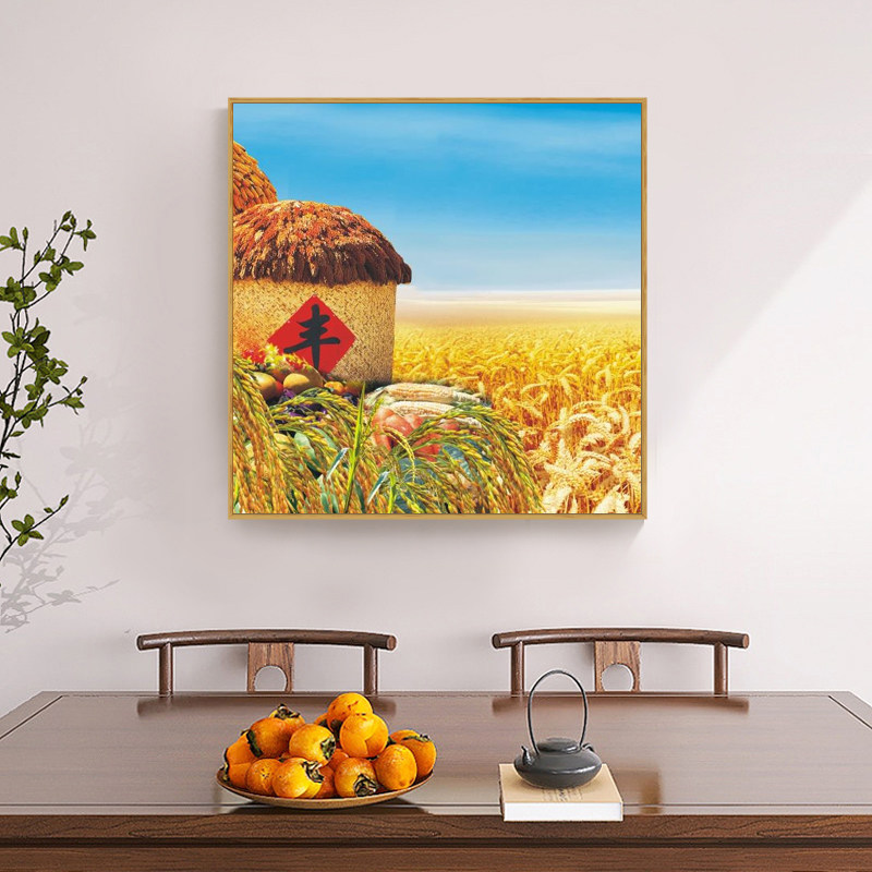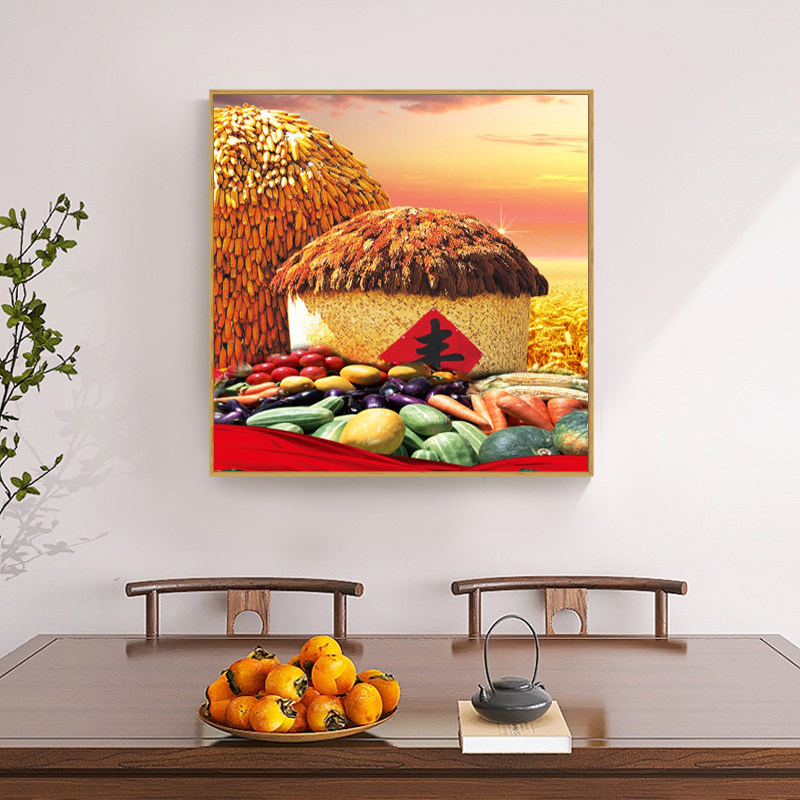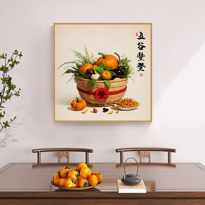 📚 新中式五谷丰登餐厅装饰画正方形中国风饭桌包厢瓜果蔬菜丰收壁画